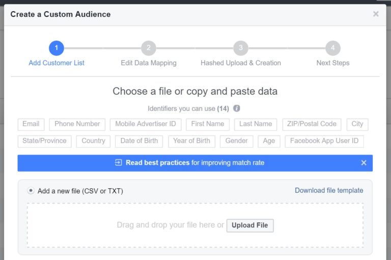 The Customer File allows you to upload a list of customer email addresses or phone numbers from your newsletter, for example, and Facebook will ‘match’ those records with user accounts. Depending on the industry you’re in, they might be anywhere from 50-80%.