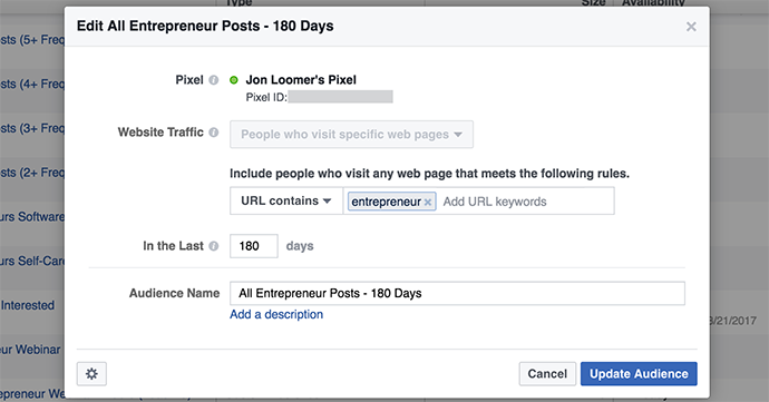 You can even take this a step further by creating different custom audiences for different types of web traffic. For example, Facebook ad pro Jon Loomer uses different audiences based on the blog post topic that person was reading about.