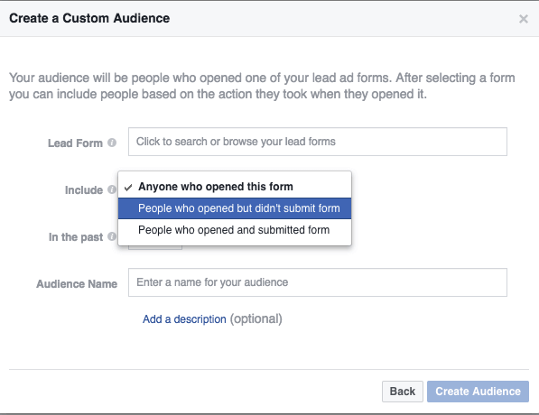 These new options now allow you to create a custom audience for all of those people who opened the lead ad in the first place, but didn’t end up converting.