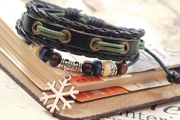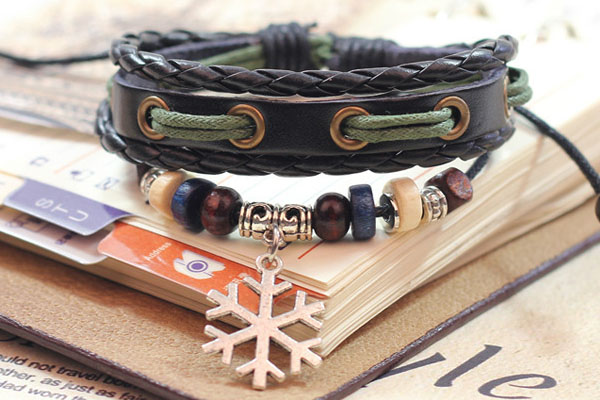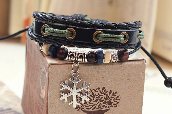 Alloy Beads Handmade Braided Black Leather Bracelet With Snowflake Pendant