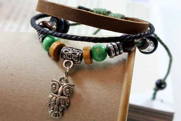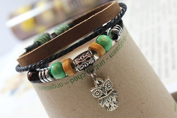 Alloy Beads Handmade Braided Leather Bracelet With Owl Pendant