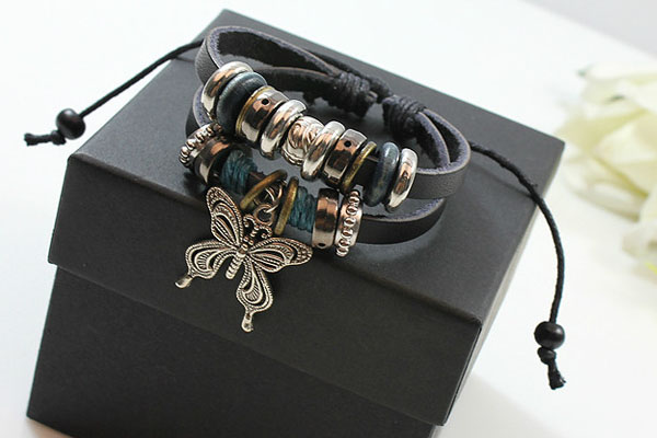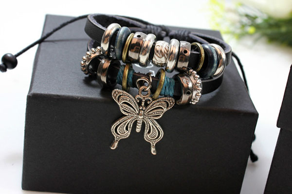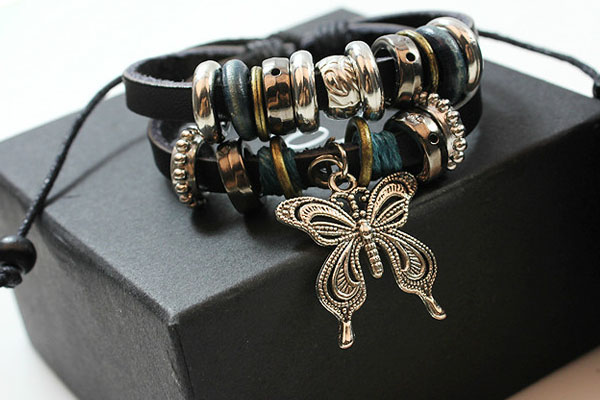 Alloy Butterfly Pendant PU Leather Bracelet With Rings