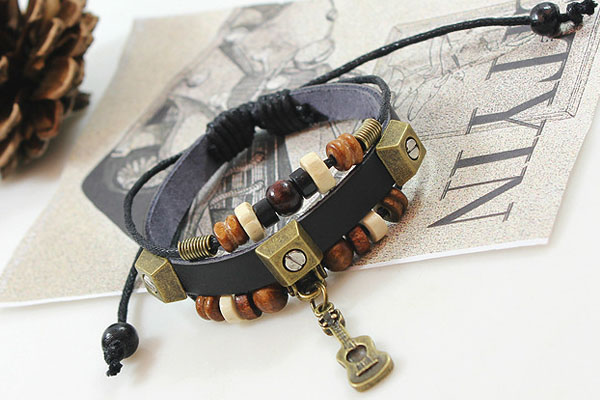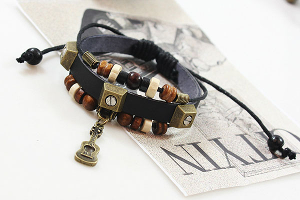 Alloy Guitar Pendant Beads PU Leather Bracelet With Rivets Studded