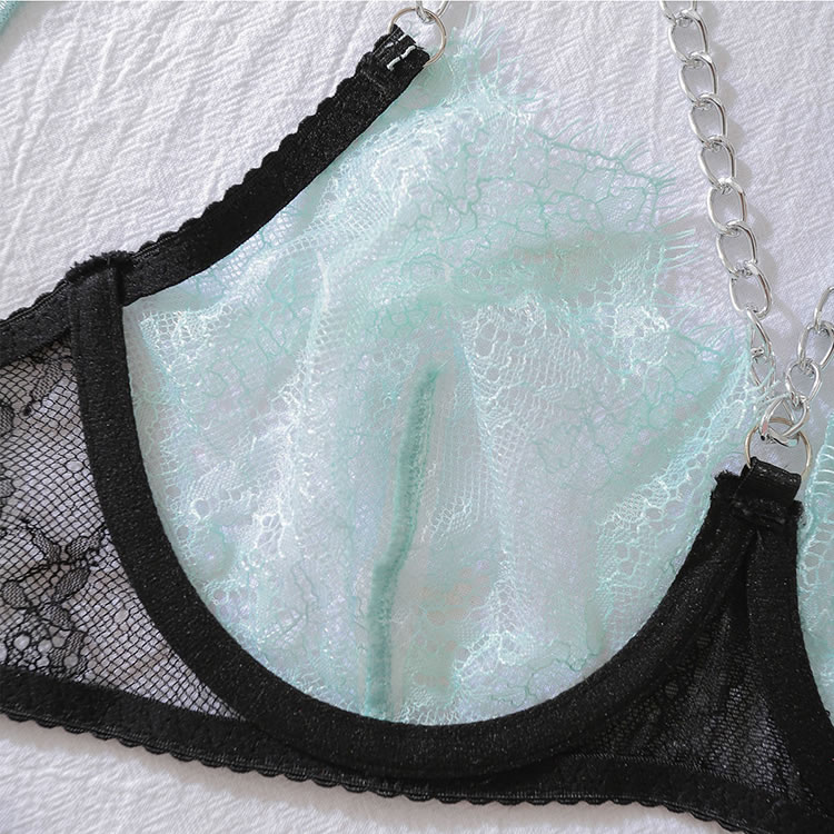 This striking lingerie set combines bold black lace with delicate green accents for a captivating look. The bra features intricate lace detailing and chain embellishments that enhance the natural curves, while the matching garter belt adds an extra layer of allure. Perfect for those who want to feel both confident and seductive.