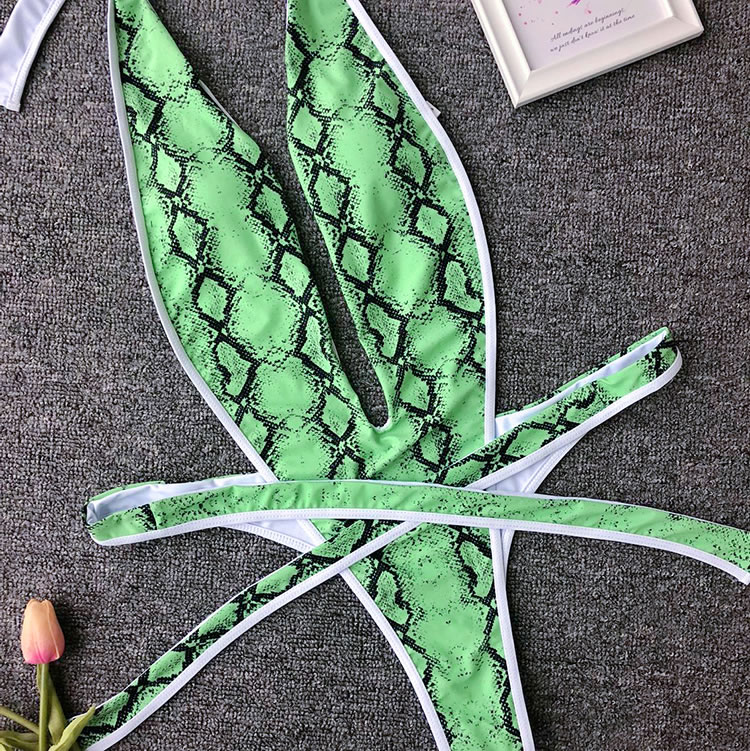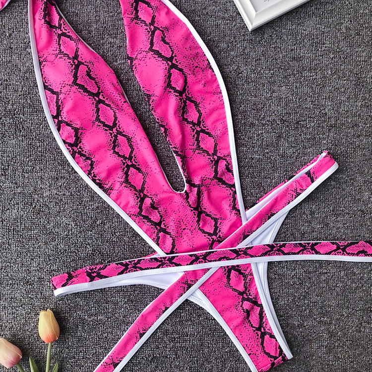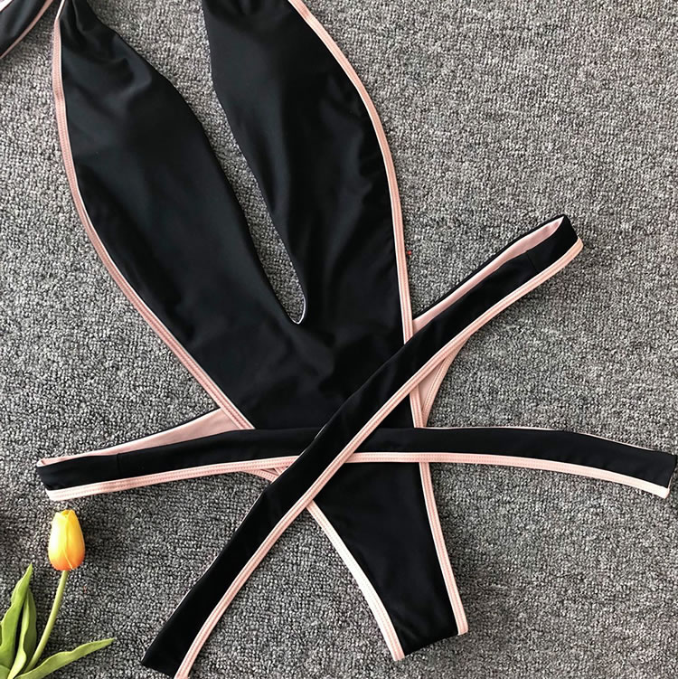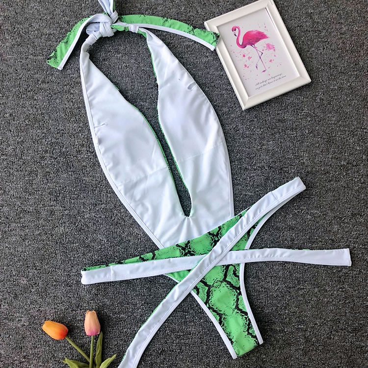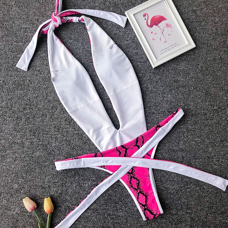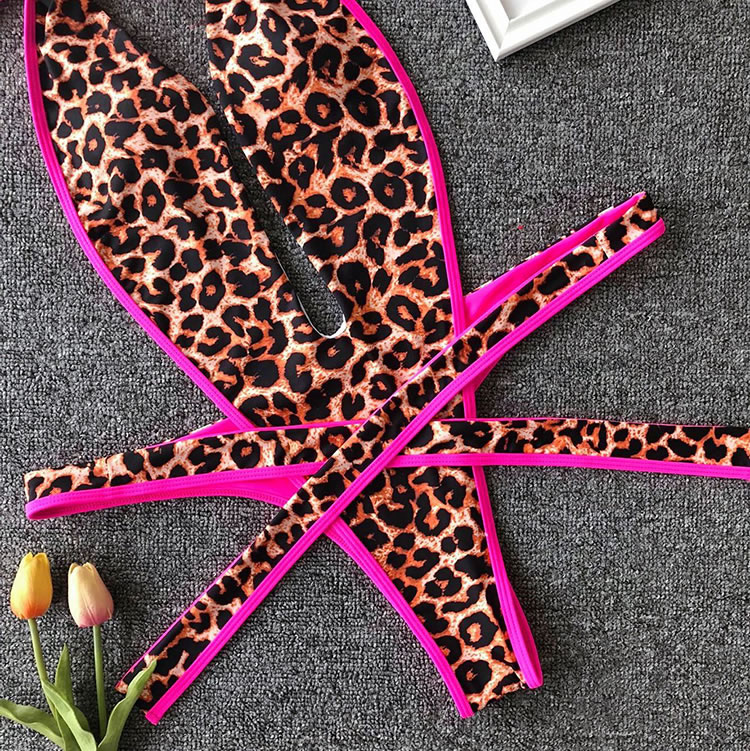 Show off your wild side with this swimwear featuring a plunging V-neckline, halter straps, a center bodice panel with open sides, a thick strappy bottom with a tie front closure, and a cheeky cut back.