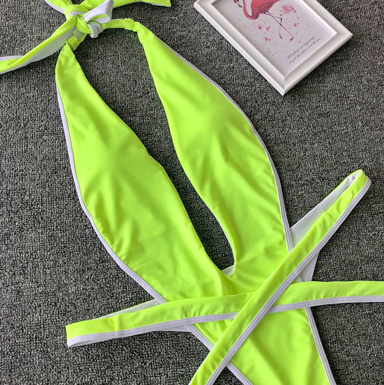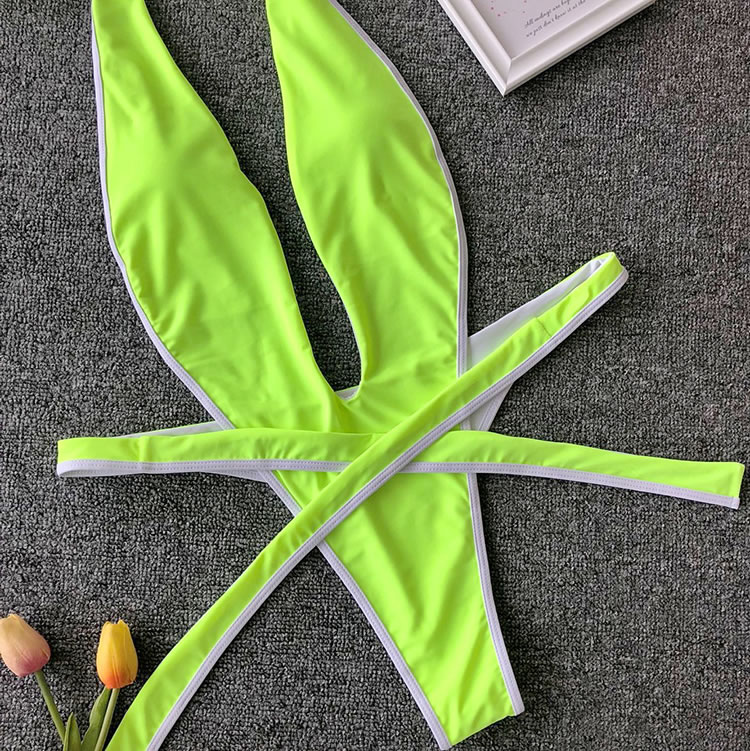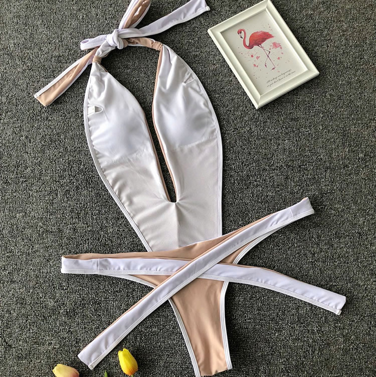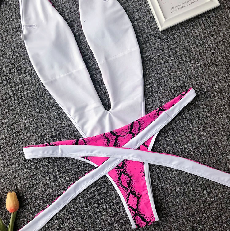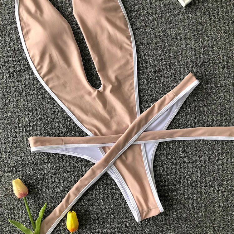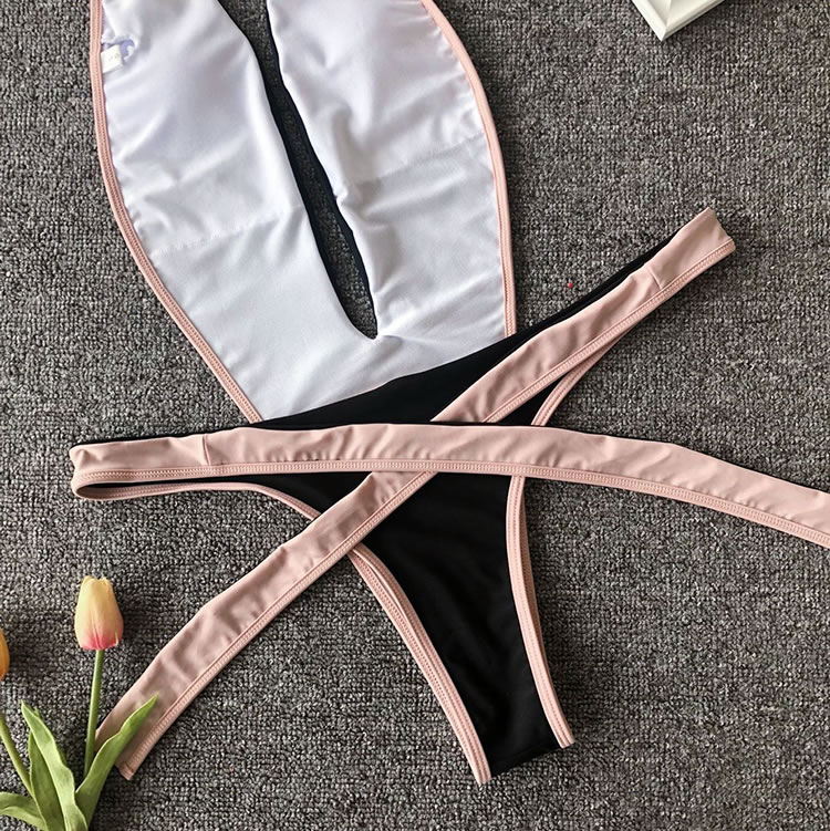 Show off your wild side with this swimwear featuring a plunging V-neckline, halter straps, a center bodice panel with open sides, a thick strappy bottom with a tie front closure, and a cheeky cut back.