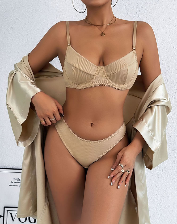 Beige Ribbed Bra and Brief Set