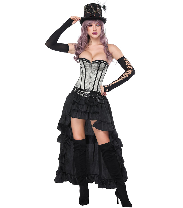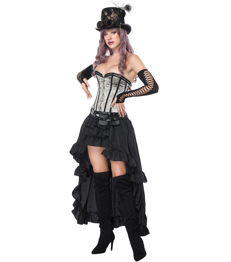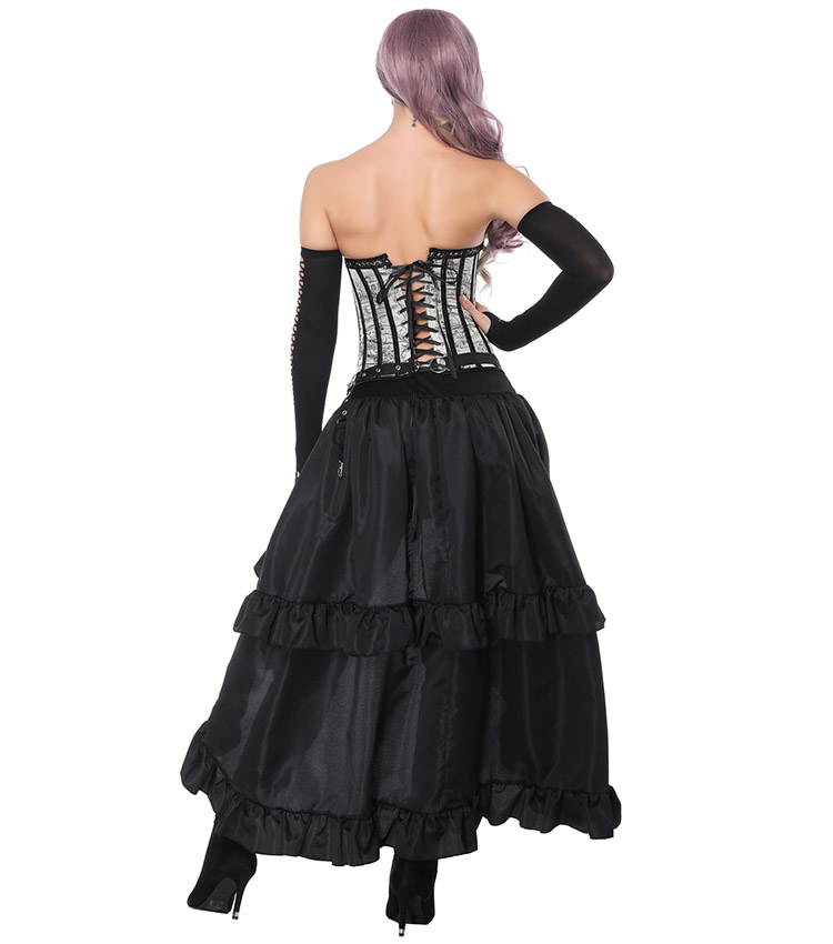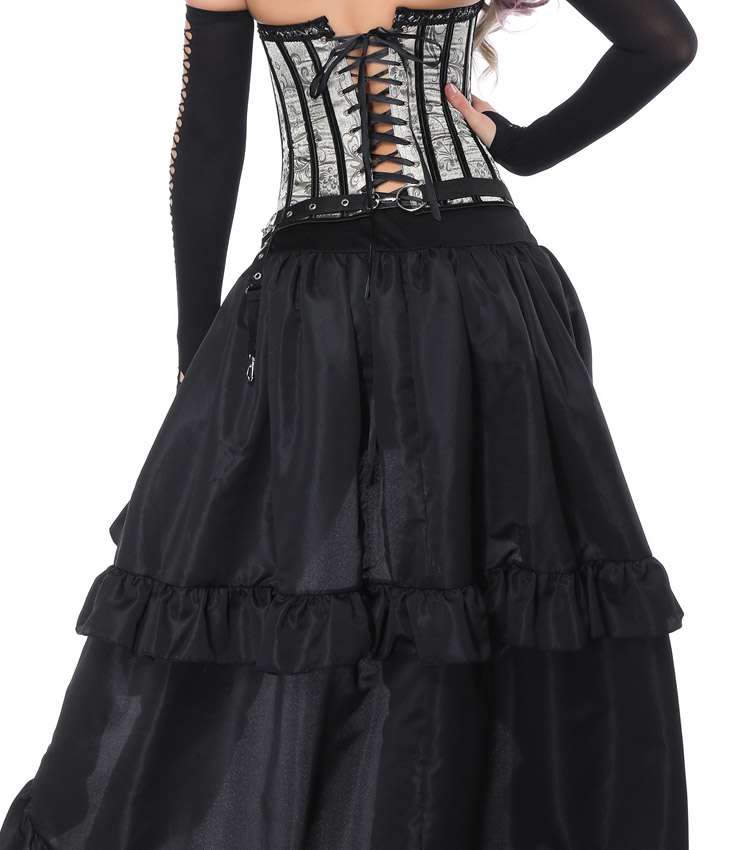This jacquard corset featured a sweetheart neckline with criss-cross detailing, steel busk front closure, and a lace-up back closure, a black belt, and a matching high low skirt.