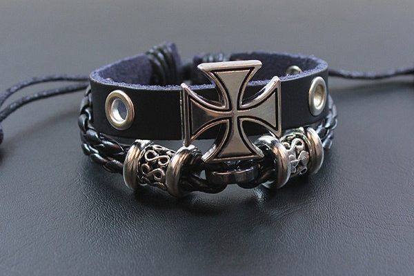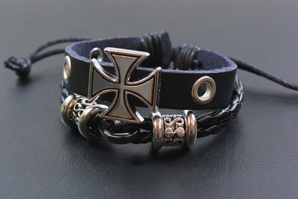 Black Dual Strand Alloy Cross Braided Leather Bracelet
