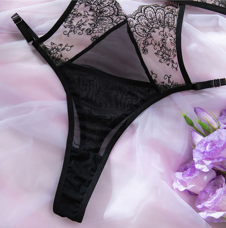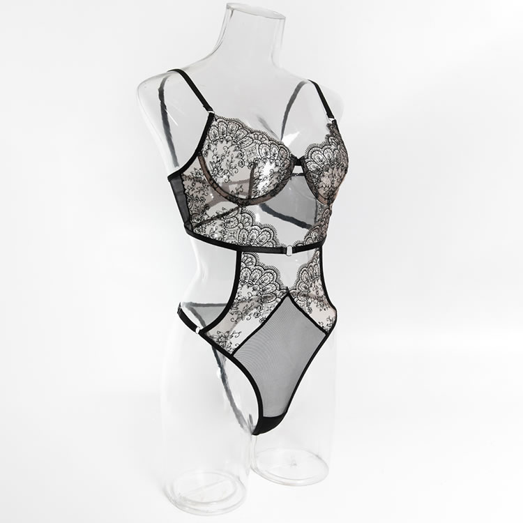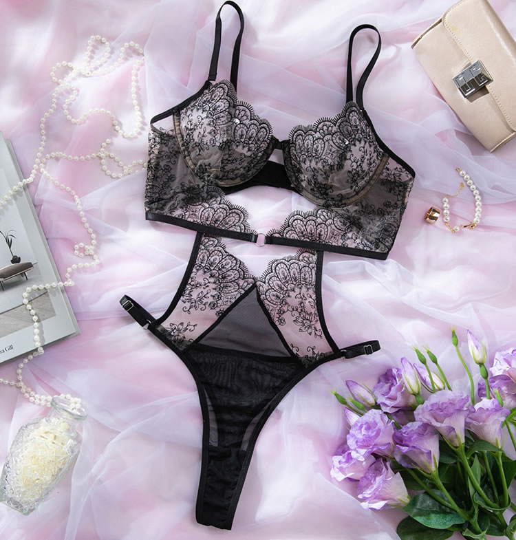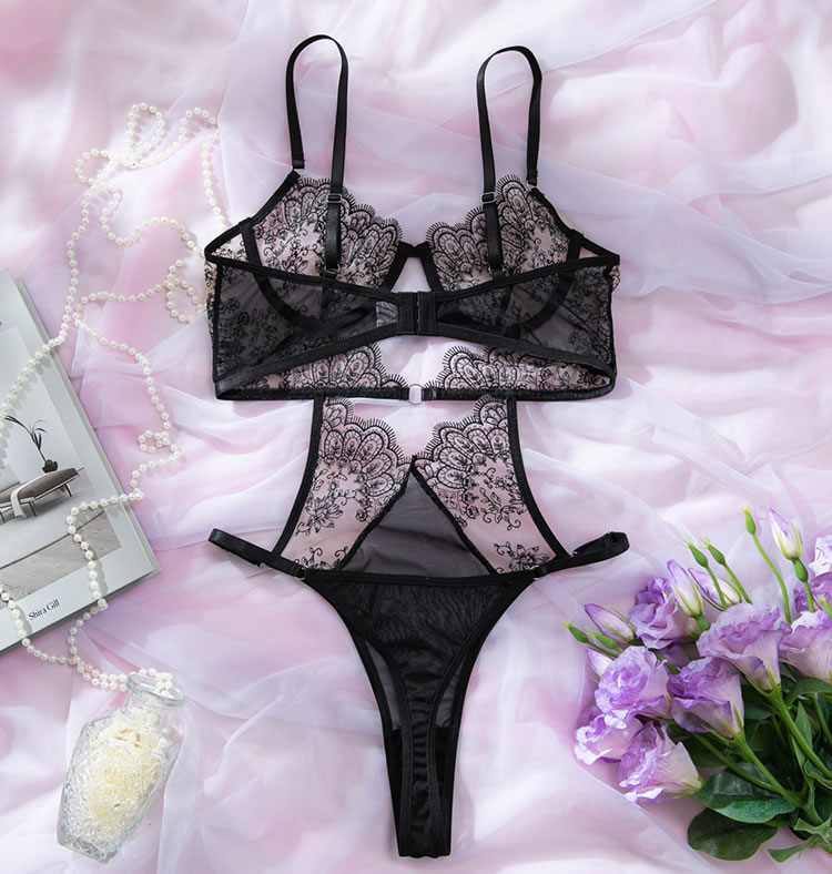 This striking lingerie costume features a high-impact black bra crafted from sheer mesh and ornate lace, offering both structure and sensuality. The deep sweetheart neckline is framed by delicate floral lace patterns, while the central cutout at the midriff adds a daring touch. Paired with a matching thong that includes a diamond-shaped mesh panel and side cutouts, this set emphasizes bold lines and elegant transparency. Thin adjustable straps and a back clasp complete the look, making it ideal for intimate moments or fashion-forward events.