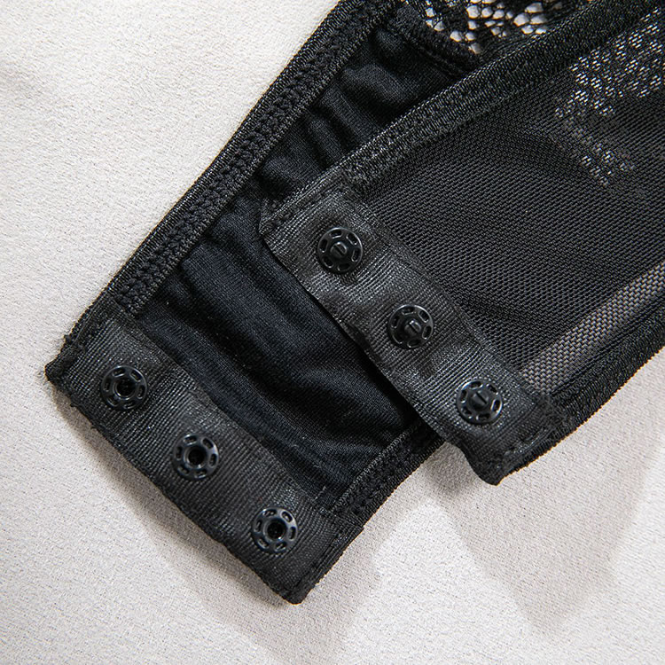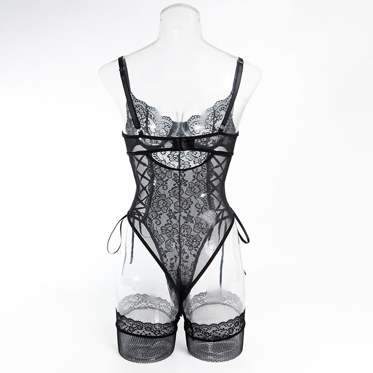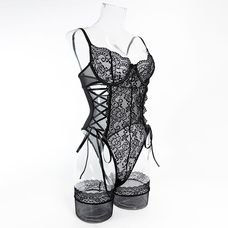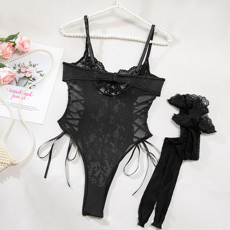 This elegant black lace bodysuit features a delicate floral pattern and a flattering silhouette that enhances natural curves. Designed with adjustable side ties and a deep V-neckline, it offers a bold yet feminine look. The open back and sheer mesh panels add a touch of allure, while the built-in bra support ensures comfort and shape. Paired with matching fishnet stockings, this piece is perfect for intimate moments or special occasions where confidence and style shine.