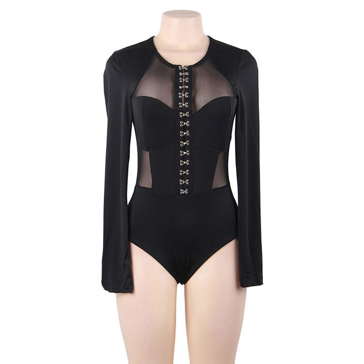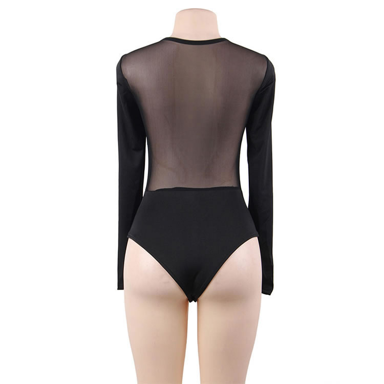 This provocative bodysuit features a scoop neckline, a front hook and eye closure, long sleeves, an opaque bottom with high cut sides, a snap crotch, and a cheeky cut back.