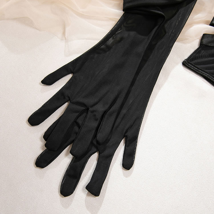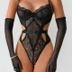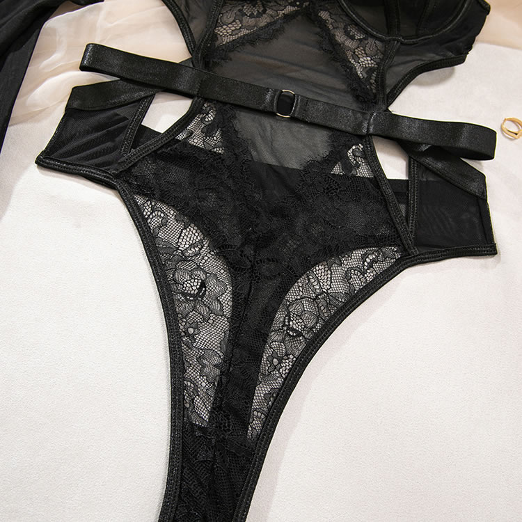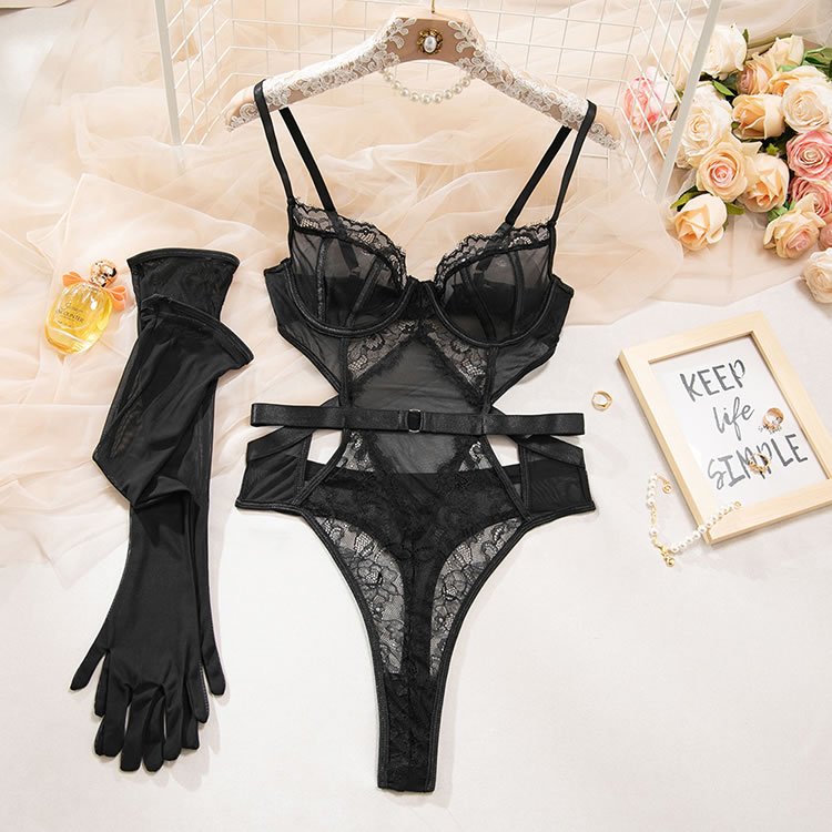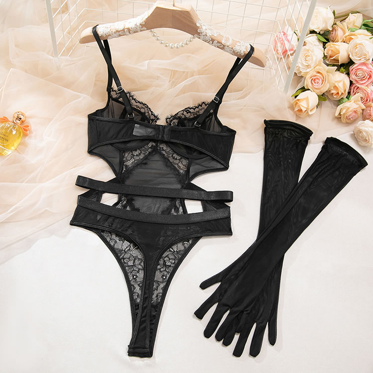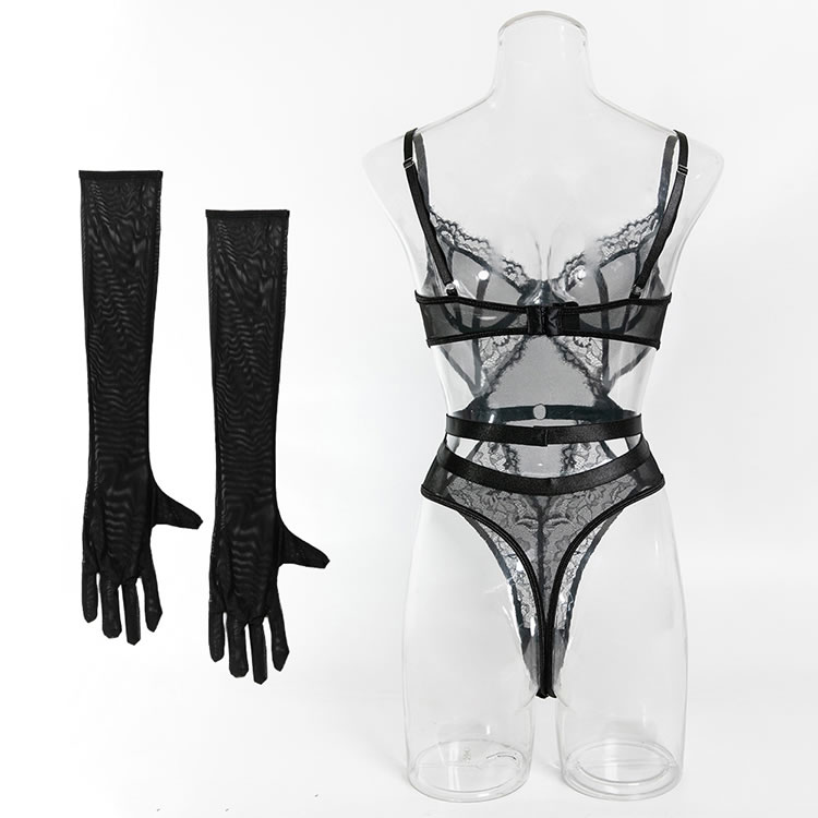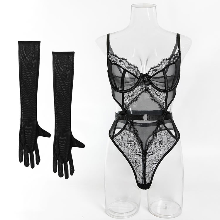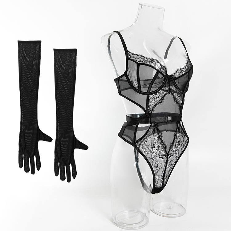 This daring black lingerie costume features a high-cut, one-piece bodysuit crafted from sheer mesh and intricate lace detailing. The design includes a structured underwire bra section, multiple cutouts across the torso and hips, and a wide waistband that wraps around the back for a sleek fit. Paired with long sheer gloves, it creates a cohesive and striking look perfect for themed events, photoshoots, or intimate occasions. The combination of transparency and texture adds depth and drama to the overall silhouette.