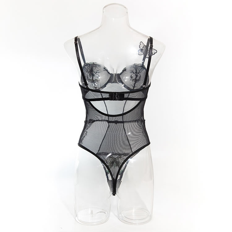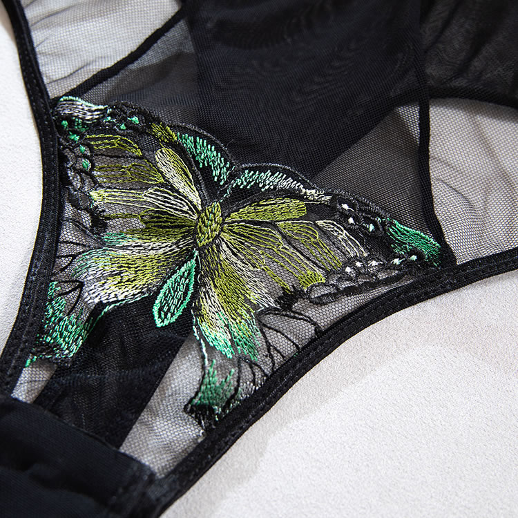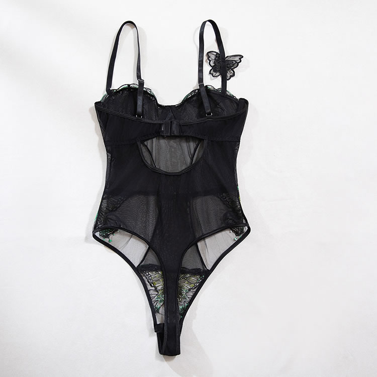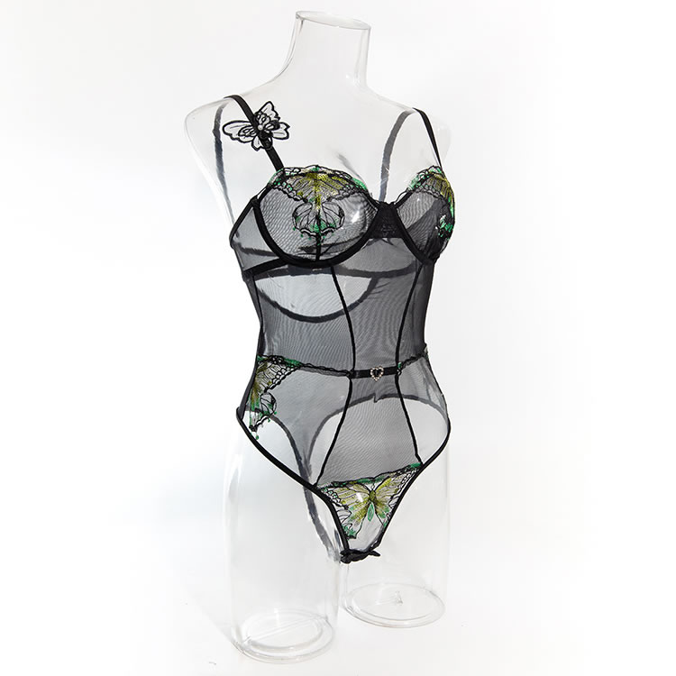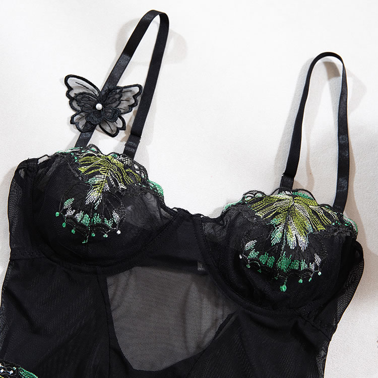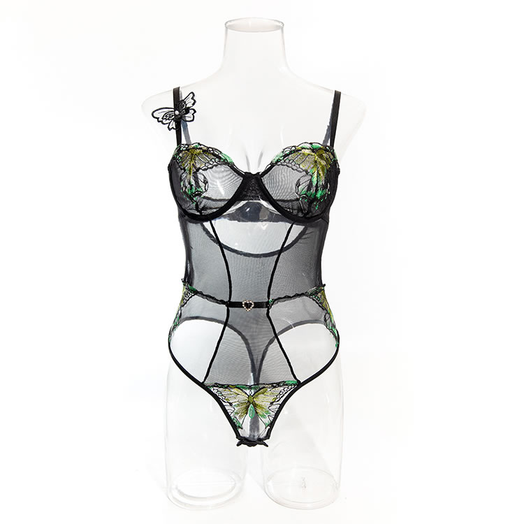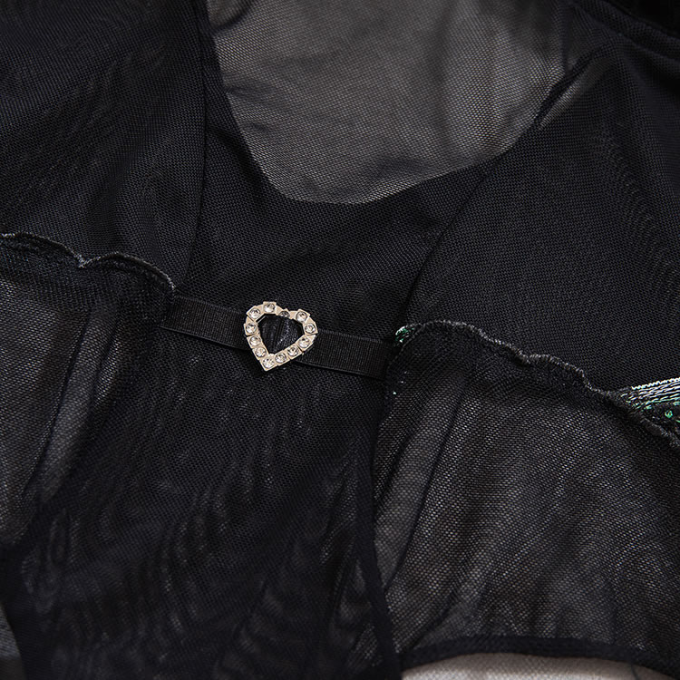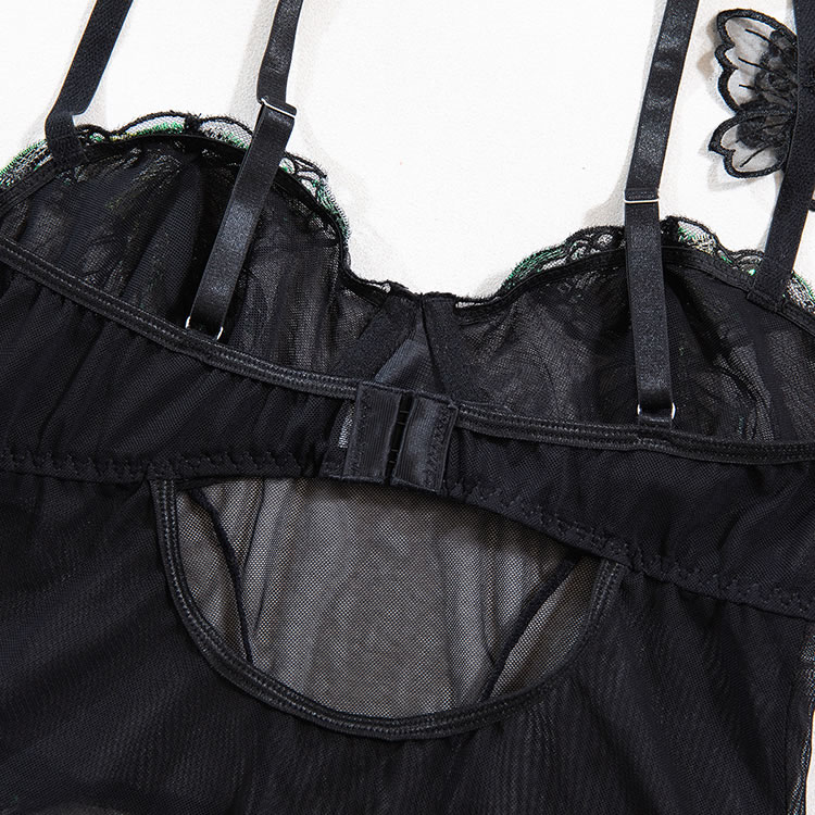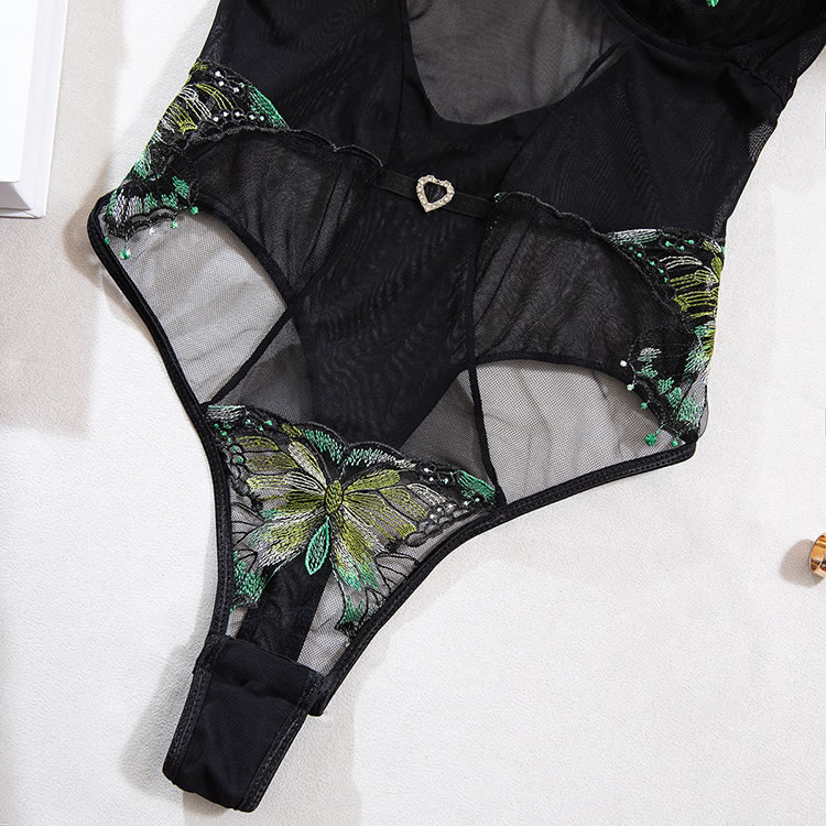 This black mesh bodysuit features a bold design with tropical leaf embroidery on the bust and lower back, adding a playful yet sensual touch. The sheer fabric is structured with vertical panels and a central heart-shaped accent at the waist, creating a flattering silhouette. With thin adjustable straps and a cut-out back, it offers a modern and daring look. Designed to enhance natural curves, this piece pairs well with matching accessories for a complete statement ensemble.