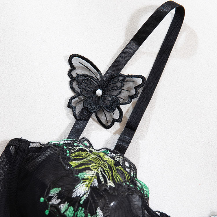 Black Mesh Bodysuit with Tropical Leaf Embroidery
