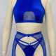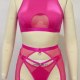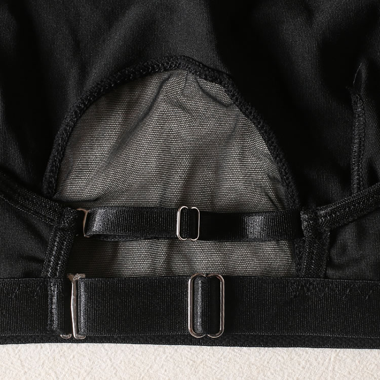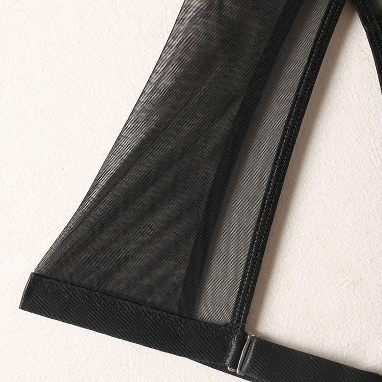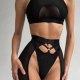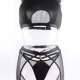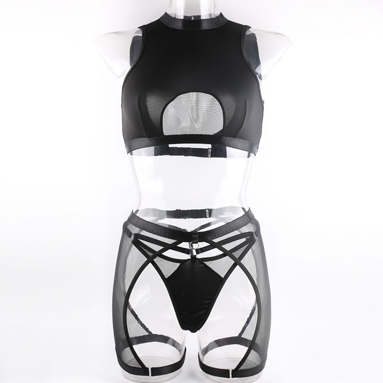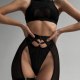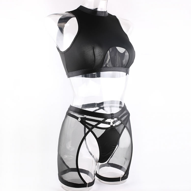 This striking black lingerie set combines daring design with sleek silhouette, featuring a high-neck crop top with sheer panel cutouts and a matching garter-style bottom with crisscross detailing. The minimalist yet edgy aesthetic makes it perfect for those who love to make a statement. Designed for confidence and comfort, this set is ideal for intimate moments or bold fashion statements.