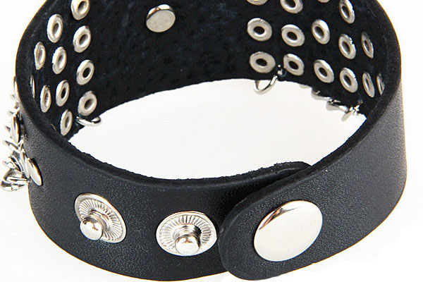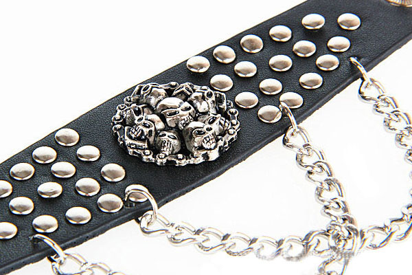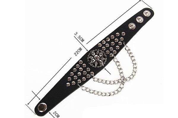 Black Rocker Skull Round Rivets PU Leather Bracelet With Metal Chains