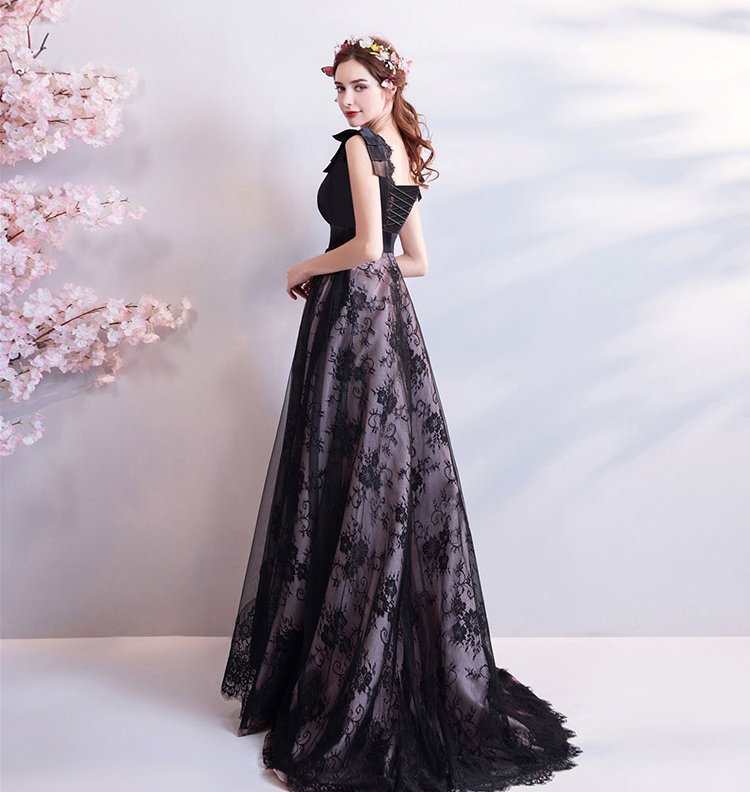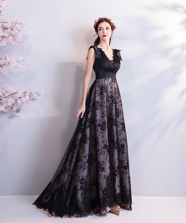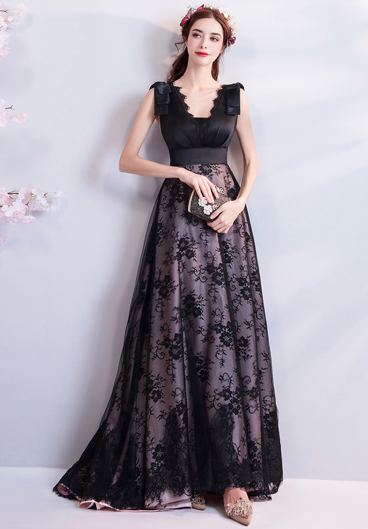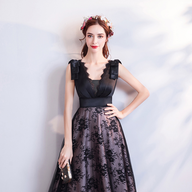 Black V-neck Sleeveless Embroidery Lace Prom Gowns