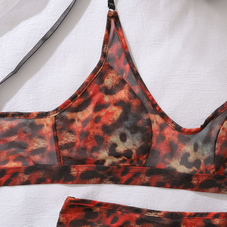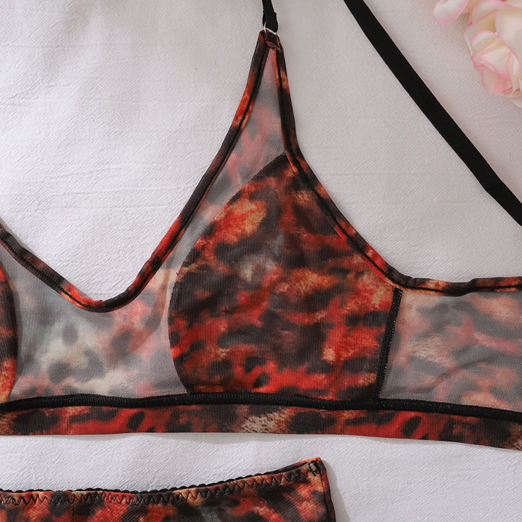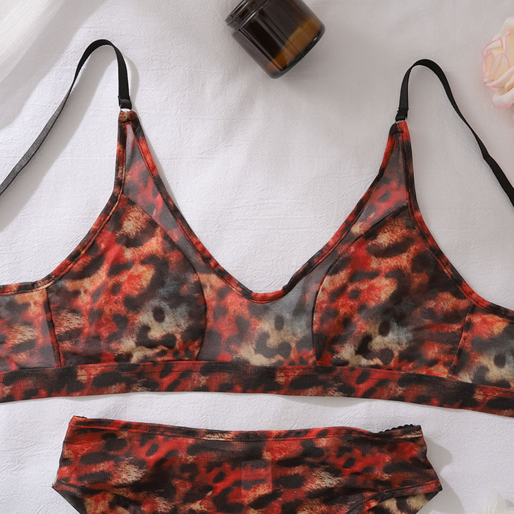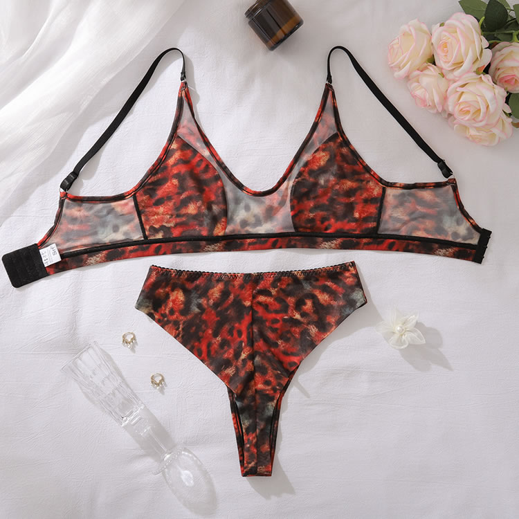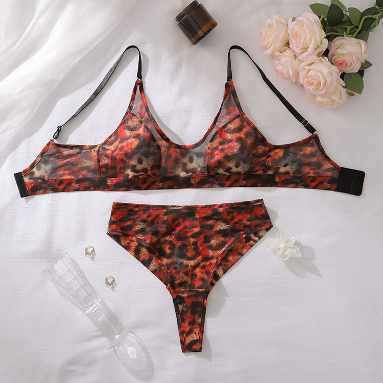This striking leopard print lingerie set is designed to make a statement with its bold pattern and sheer fabric. The bra features a deep scoop neckline that accentuates the natural curves, while the matching high-waisted panties add an extra layer of allure. Perfect for those who want to feel both confident and seductive.