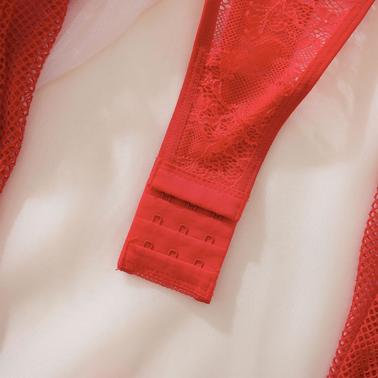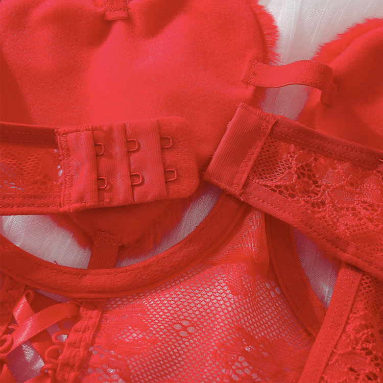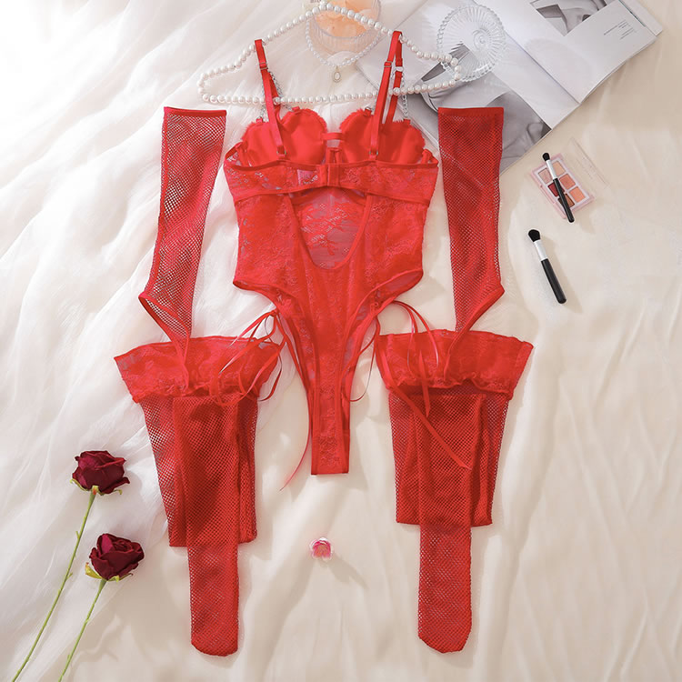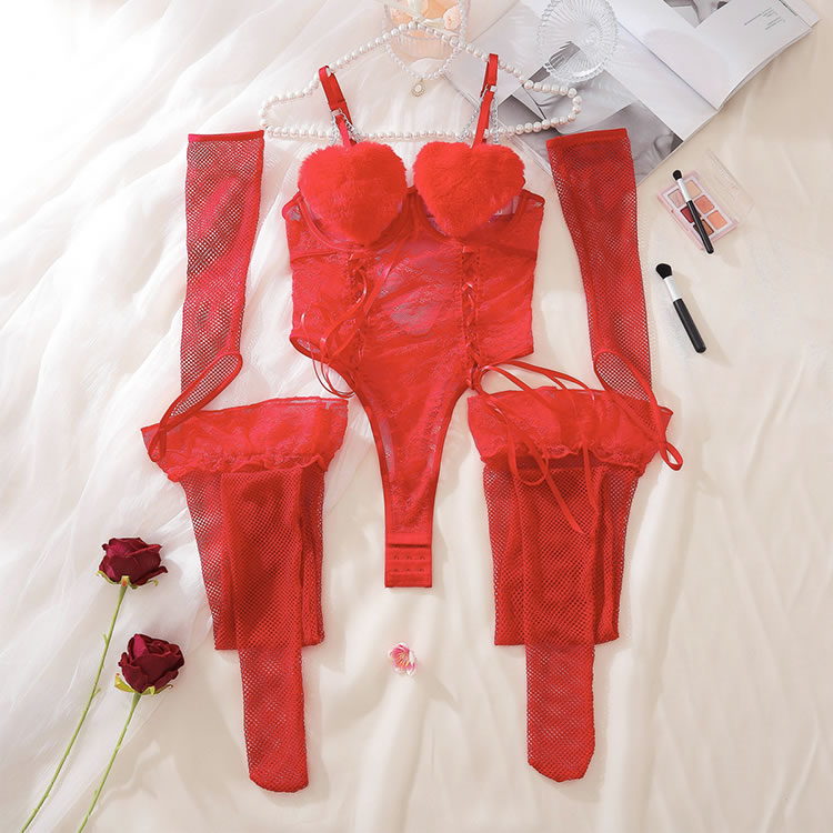 This striking red bodysuit is designed to make a statement with its playful heart-shaped accents and intricate lace detailing. The bodysuit features adjustable straps and charming bows that enhance its allure, while the matching fishnet sleeves and stockings complete the look. Perfect for those who want to feel both confident and seductive.