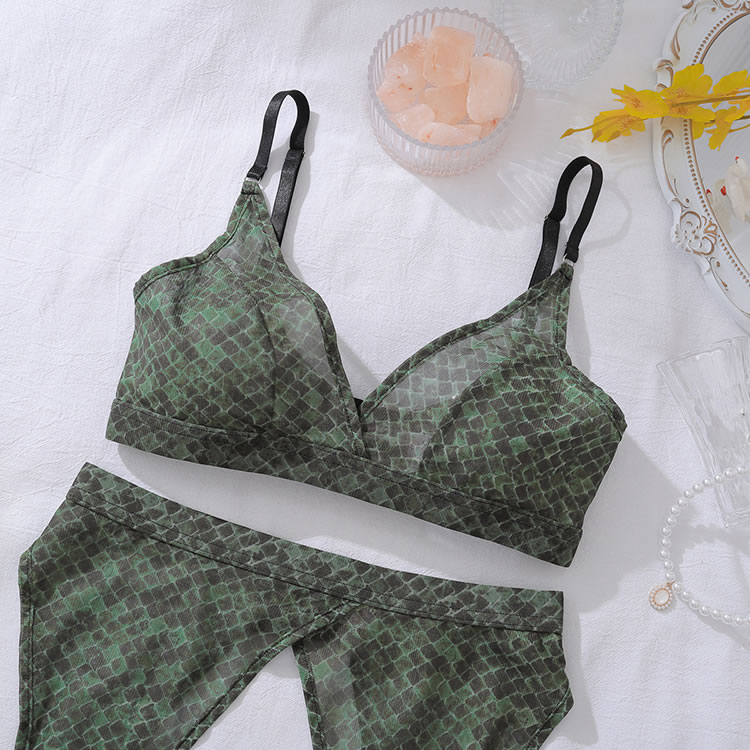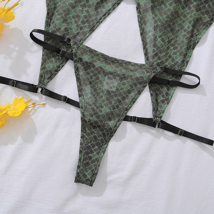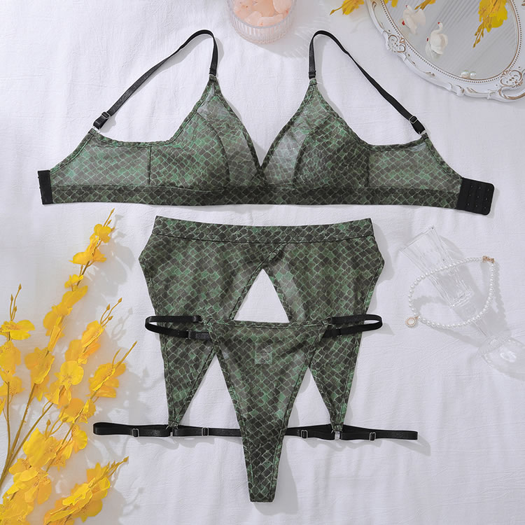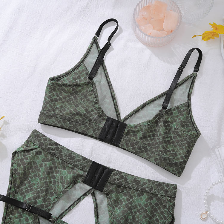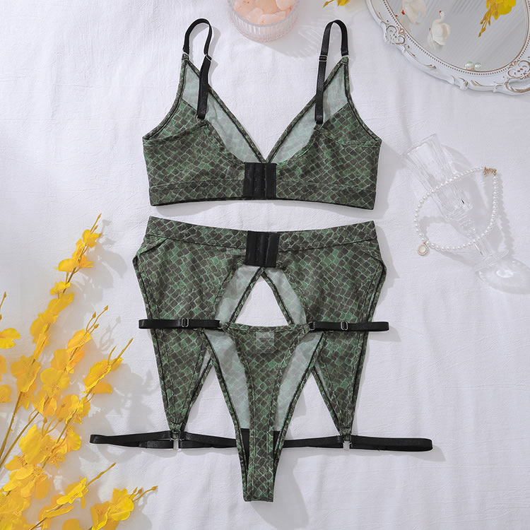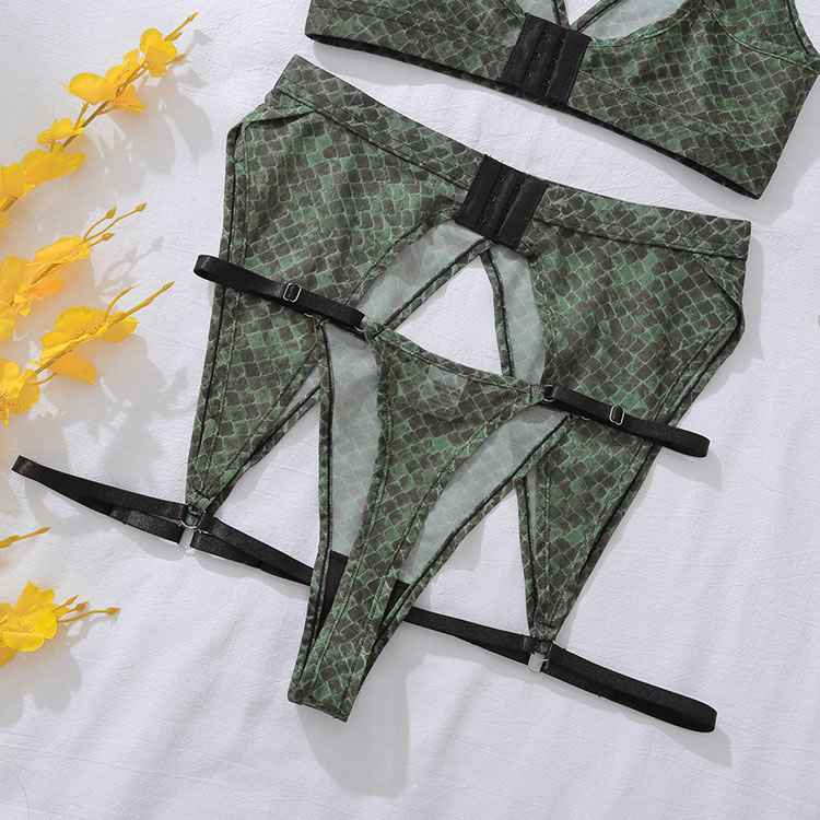 This striking snake print lingerie set is designed to captivate with its bold pattern and unique design. The bra features a deep V-neckline that accentuates the natural curves, while the matching thong and garter belt add an extra layer of allure. Perfect for those who want to feel both confident and seductive.
