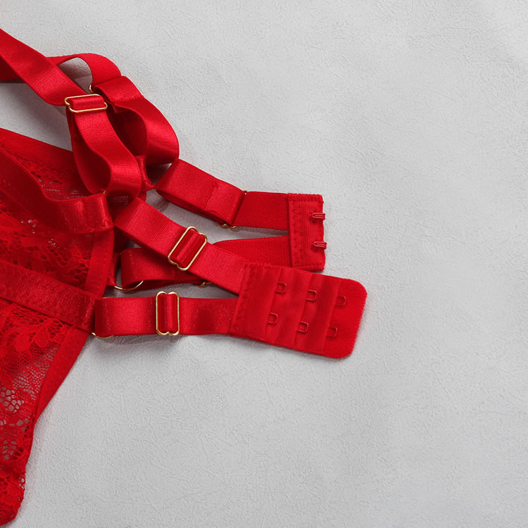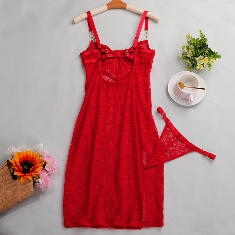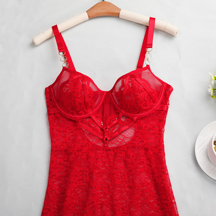 This vibrant red lace chemise is a perfect blend of boldness and allure. The intricate lace detailing and sheer panels create an enticing silhouette that exudes confidence. The adjustable straps with gold accents add a touch of elegance, making it ideal for special nights or intimate moments.