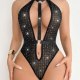 Make a daring statement with this eye-catching mesh bodysuit that blends edgy design with sensual appeal. Featuring a deep plunging neckline and strategic cutouts, it's crafted to highlight your curves with confidence. The halter-style neck tie adds a touch of elegance, while the sheer diamond-patterned mesh gives it a sleek, contemporary look perfect for intimate nights or bold fashion moments.