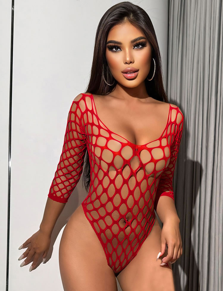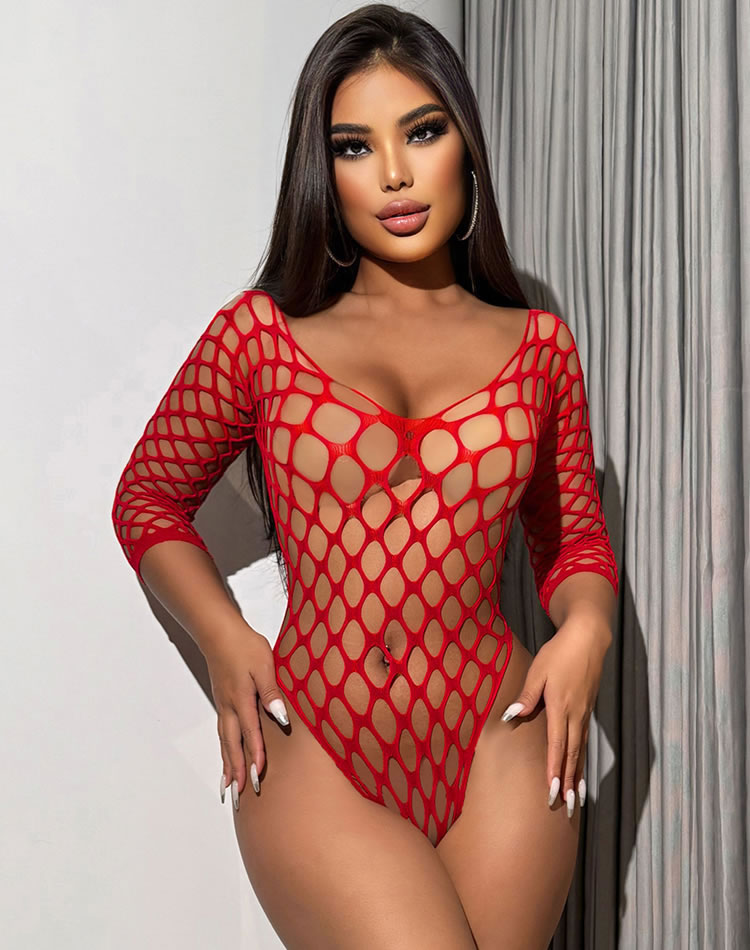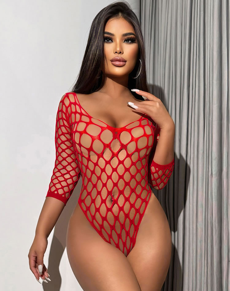 This bold and seductive lingerie set is designed to make a statement. The bodysuit features a unique honeycomb mesh pattern that combines transparency with a striking visual effect. The three-quarter sleeves add a touch of elegance, while the deep V-neckline enhances the alluring silhouette. Perfect for those who want to exude confidence and style, this set is ideal for special occasions or intimate moments.