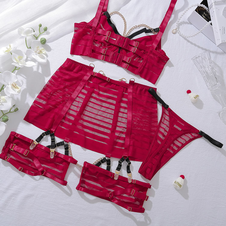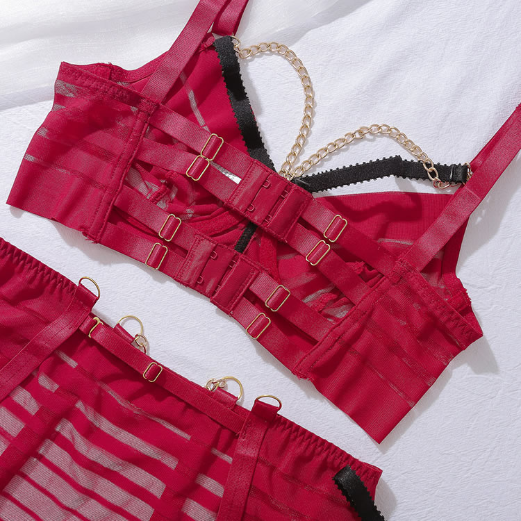 Turn heads with this bold red chain-embellished bra and skirt set. The vibrant red color is accentuated by the striking gold chains, creating a captivating look. The matching skirt features a sheer panel and a sash for added allure, making it perfect for those who want to feel confident and stylish.