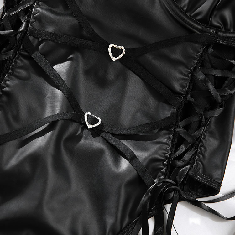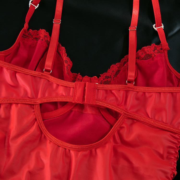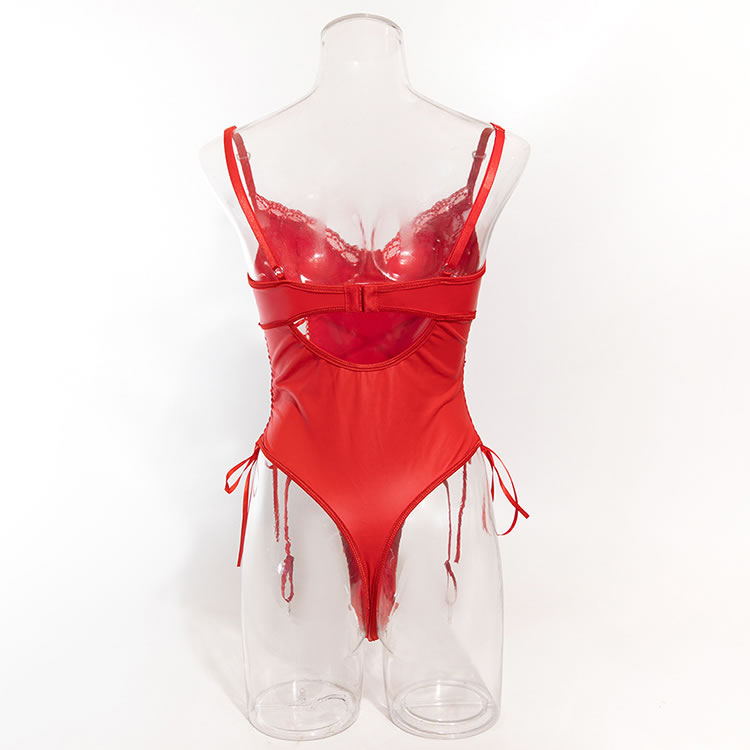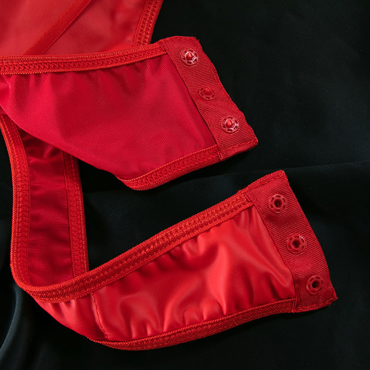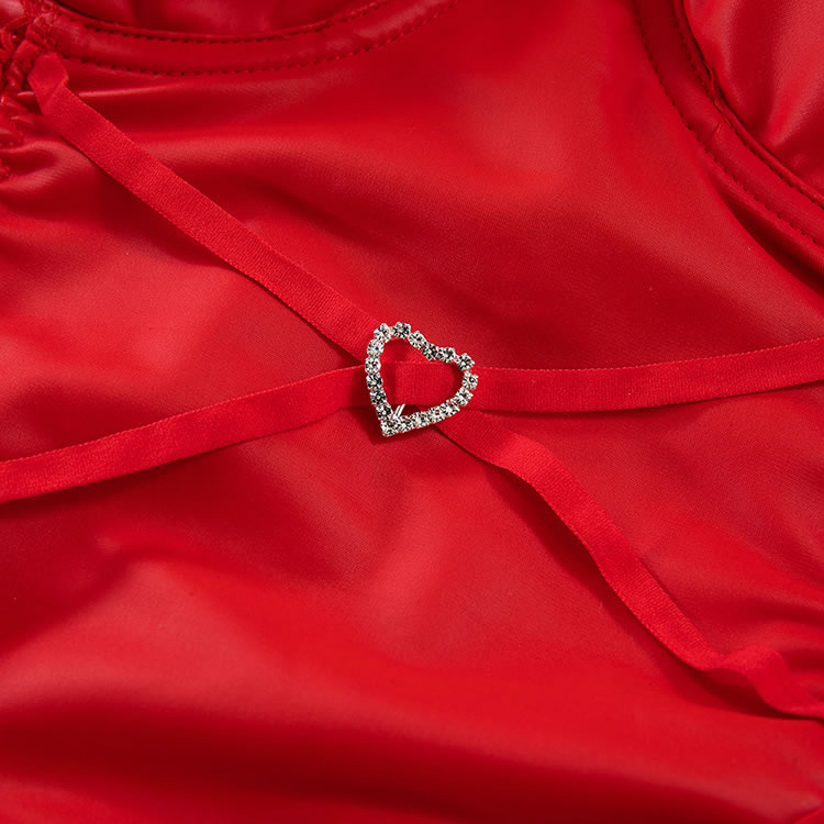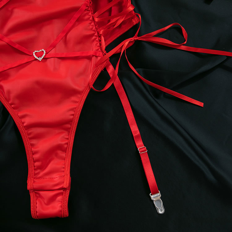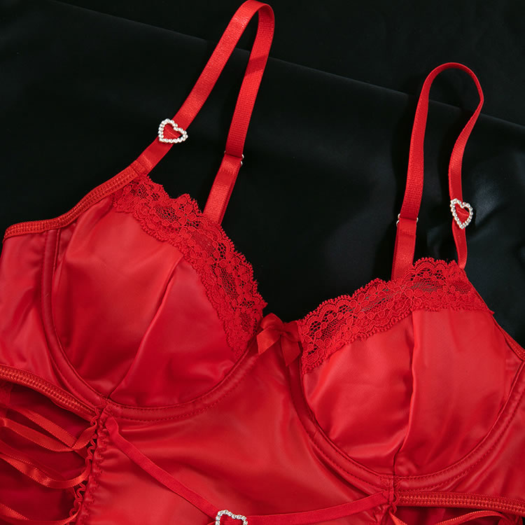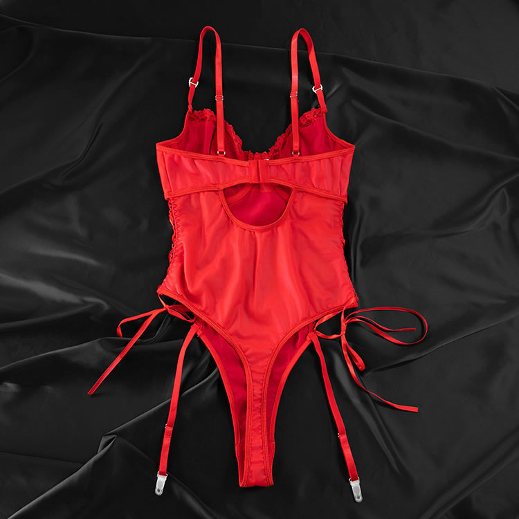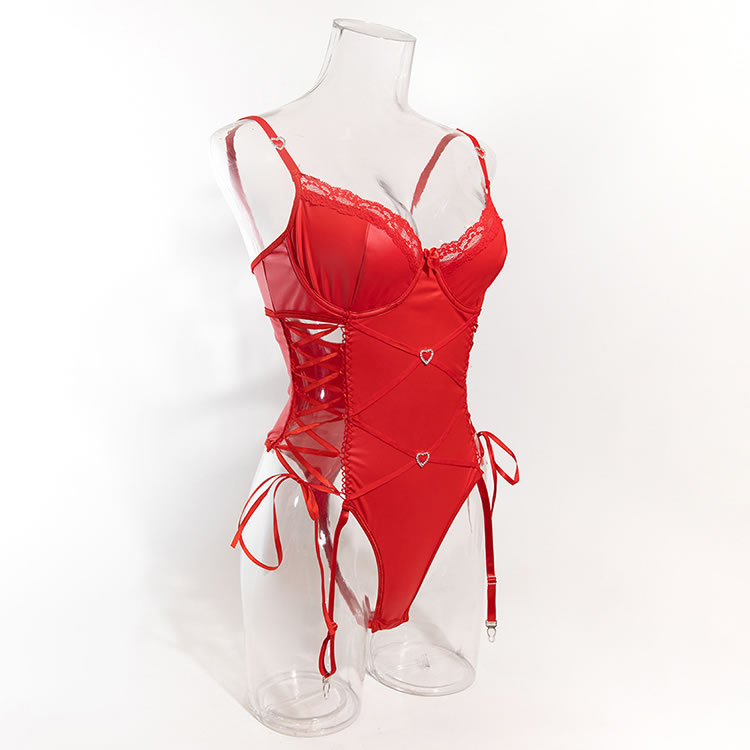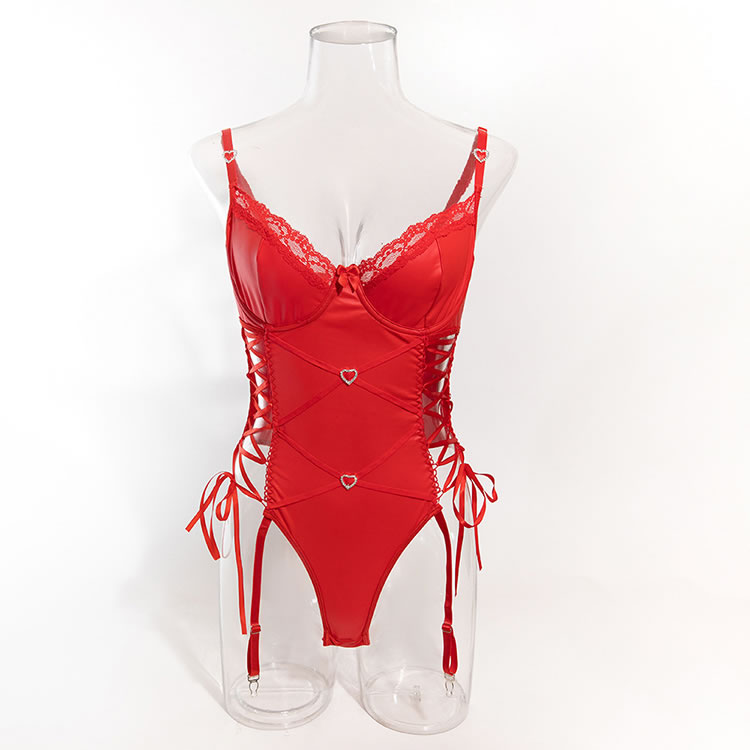 This bold red corset bodysuit is perfect for making a statement. The bodysuit features intricate lace-up details and heart-shaped embellishments that add a touch of romance and playfulness. The soft fabric ensures a smooth and sleek fit, while the deep V-neckline enhances its allure. Ideal for anyone seeking a blend of confidence and charm in their intimates.