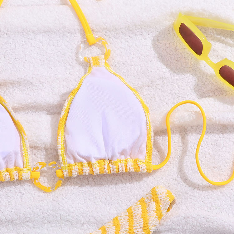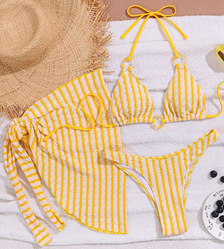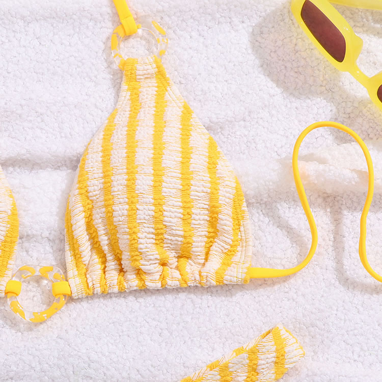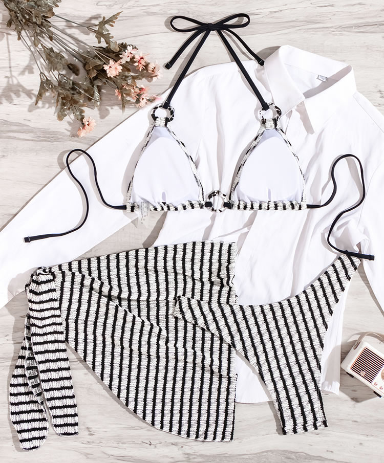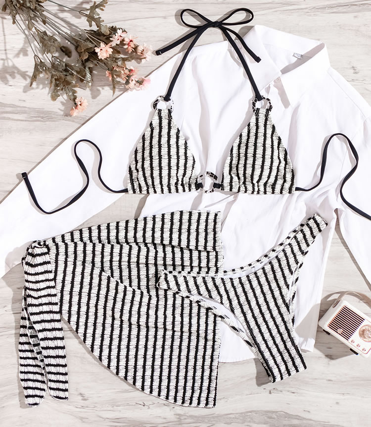 Stand out in this bold striped bikini featuring a ring detail at the center of the top. The black and white stripes create a striking contrast, while the matching wrap skirt adds a touch of elegance. This bikini is perfect for those who want to feel confident and stylish by the beach.