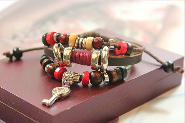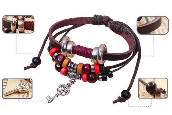 Brown Multi-strand Beads Leather Bracelet With Key Pendant