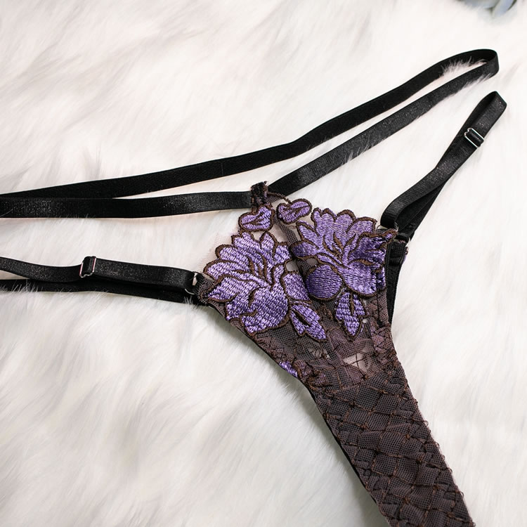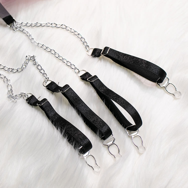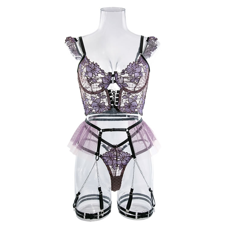 Leave them speechless in this striking bra set featuring sheer lace underwire cups, adjustable spaghetti straps and a strap with link chain detailing, a hook and eye back closure, a matching garter skirt with adjustable garter straps, wraparound leg garters, and a matching panty.