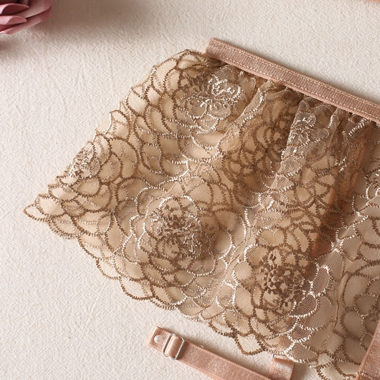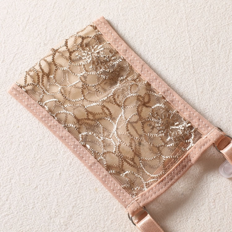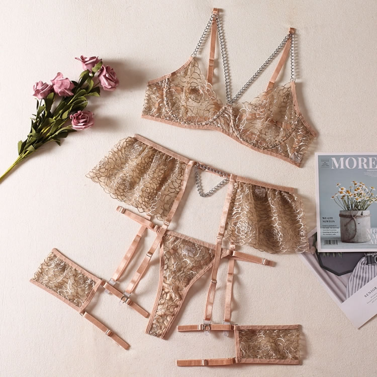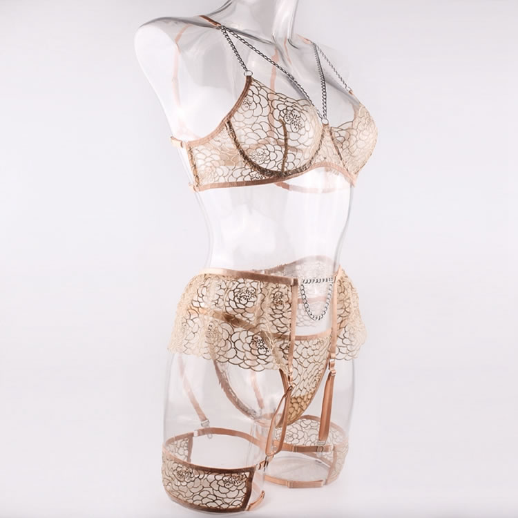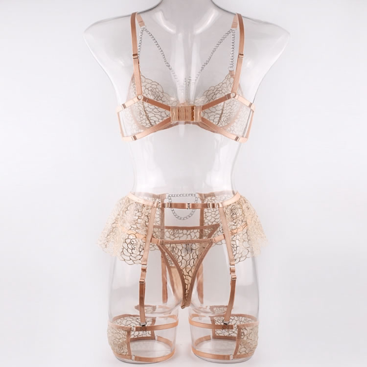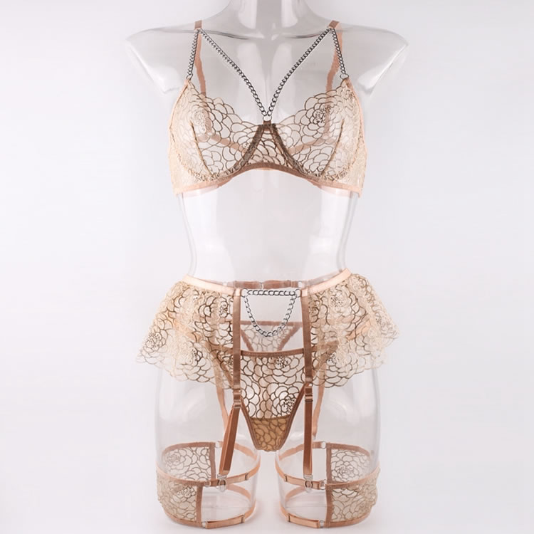 Leave them speechless in this striking bra set featuring sheer lace underwire cups, adjustable spaghetti straps with link chain detailing, a hook and eye back closure, a matching garter skirt with adjustable garter straps, wraparound leg garters, and a matching panty.