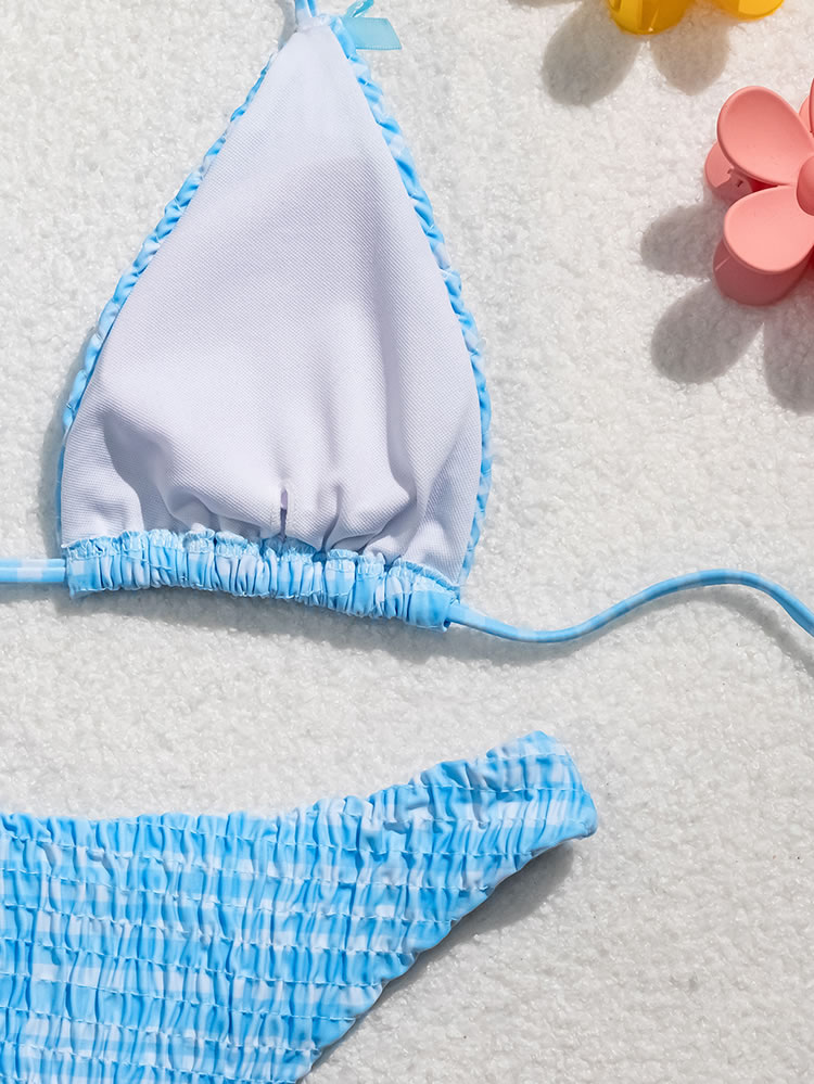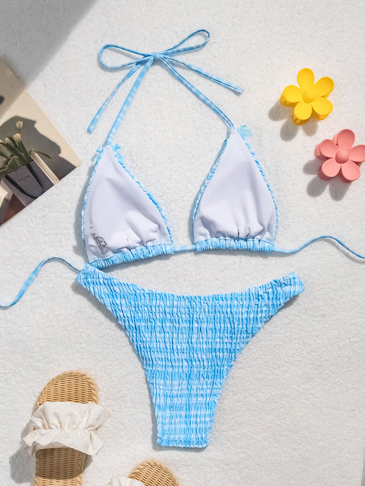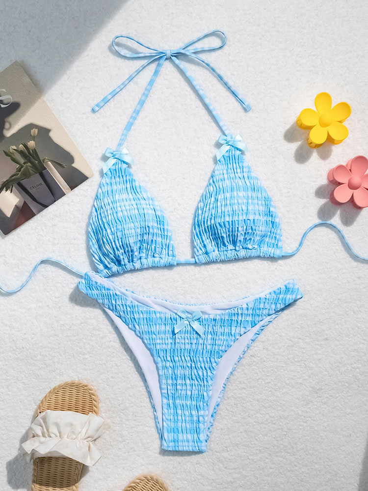 Embrace the charm of this blue and white striped bikini set. The triangle top and matching bottoms feature delicate bows that add a playful touch. The seersucker texture provides a fresh and breezy feel, making it perfect for sunny days at the beach or poolside.