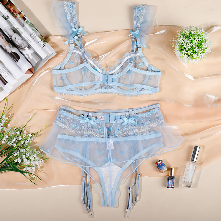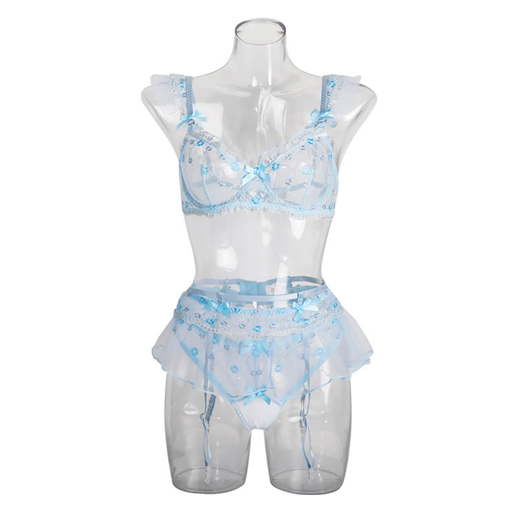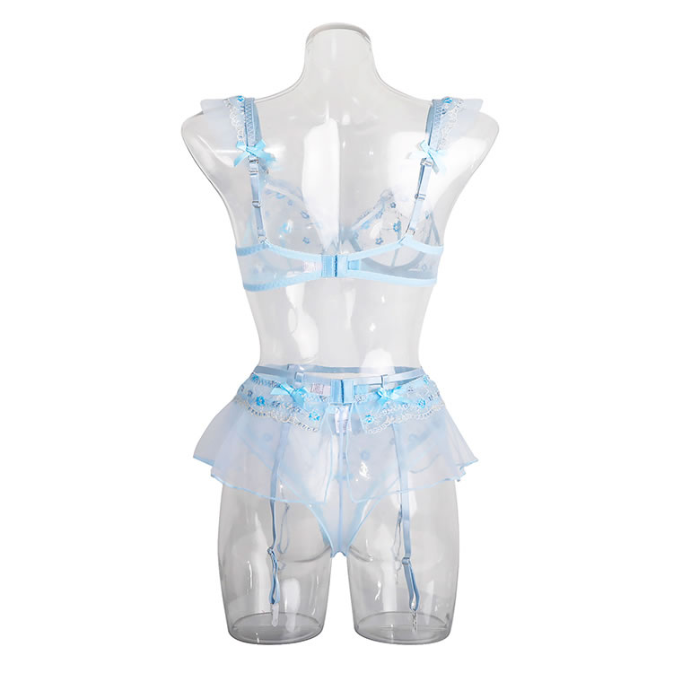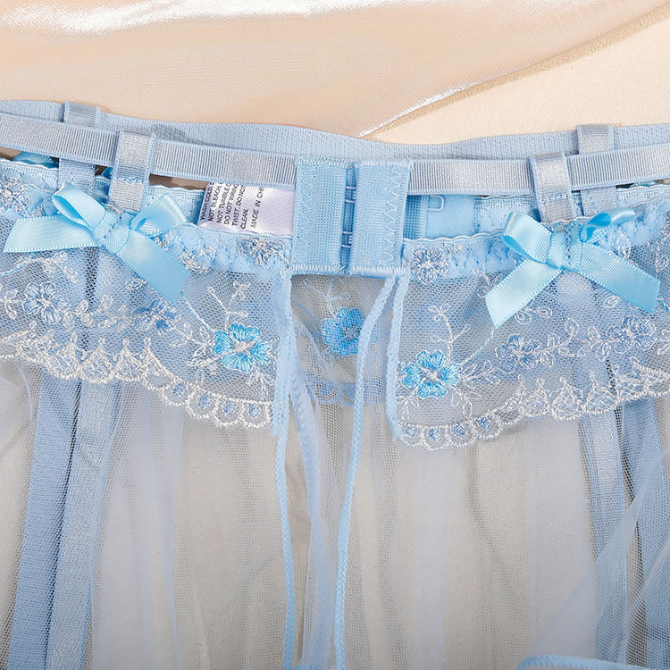 This enchanting blue lace lingerie set is perfect for those who love a touch of whimsy in their intimate wear. The sheer fabric with delicate floral embroidery adds a romantic flair, while the bow accents on the bra straps and skirt bring a playful charm. The off-the-shoulder design of the bra enhances the overall allure, making it ideal for special moments.
