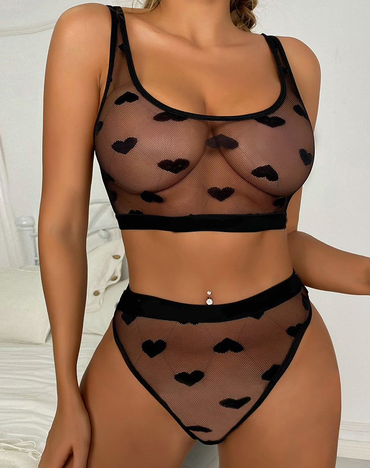 ● Bralette: The bralette has a scoop neckline and wide shoulder straps for comfort and support. The sheer mesh allows for a delicate and alluring look, while the heart pattern adds a fun and flirty element.