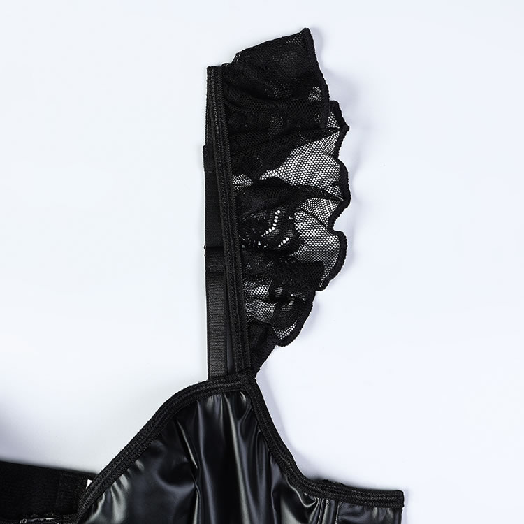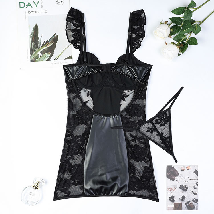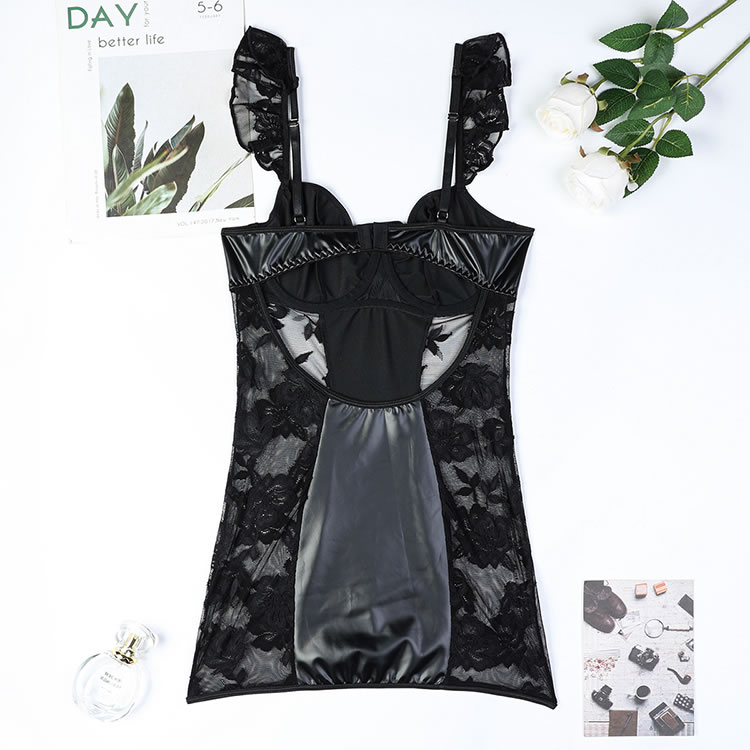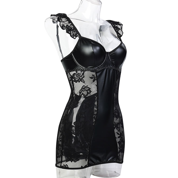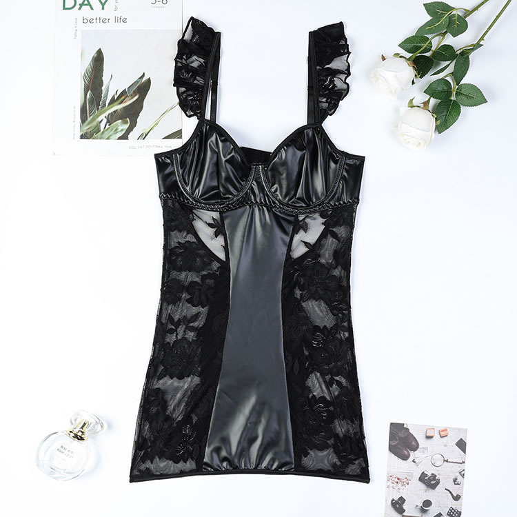 This stunning lingerie set combines elegance and allure with its sophisticated design. The chemises features a deep V-neckline, paired with delicate lace trim on the straps that adds a touch of femininity. The faux leather fabric enhances the visual appeal, while the intricate lace panels on the sides create a seductive and elegant look. The sheer lace design accentuates your curves beautifully, making it perfect for special occasions or intimate moments.