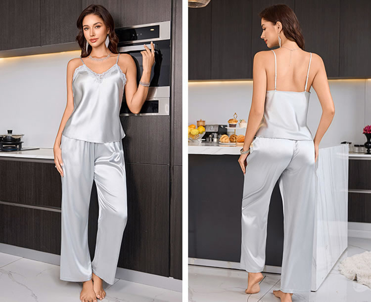 This delightful pink satin pajama set is designed for ultimate comfort and style. The soft, smooth fabric feels heavenly against the skin, while the delicate lace trim on the camisole adds a touch of femininity. The matching pants feature an elastic waistband for a snug fit, making it perfect for relaxing evenings at home.