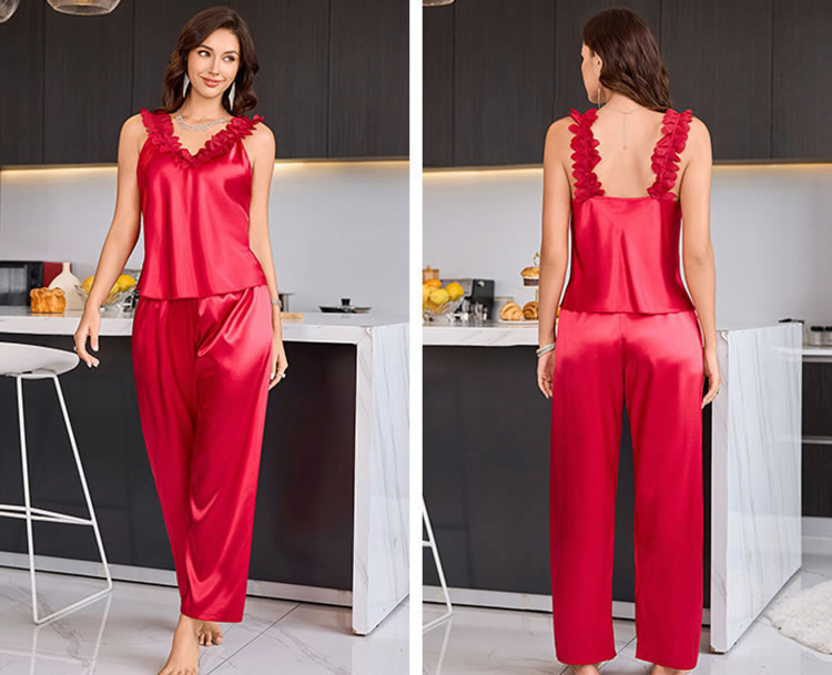 Embrace a sense of allure with this charming red sleepwear ensemble. Made from silky satin, the camisole and pants set offers a comfortable and stylish option for your loungewear collection. The floral detailing on the camisole adds a feminine touch, while the loose-fitting pants provide ultimate relaxation.