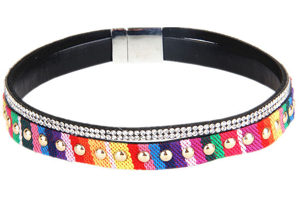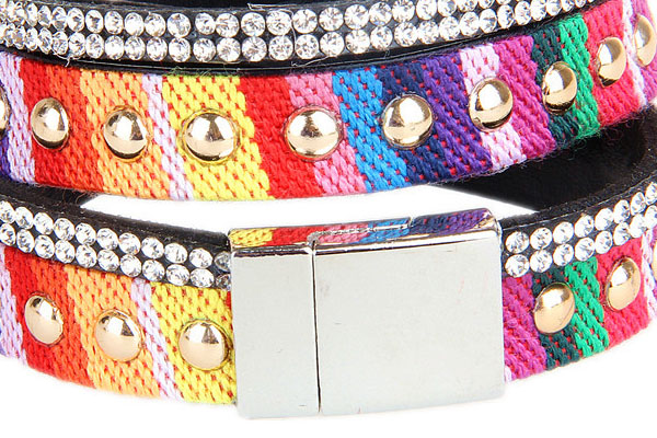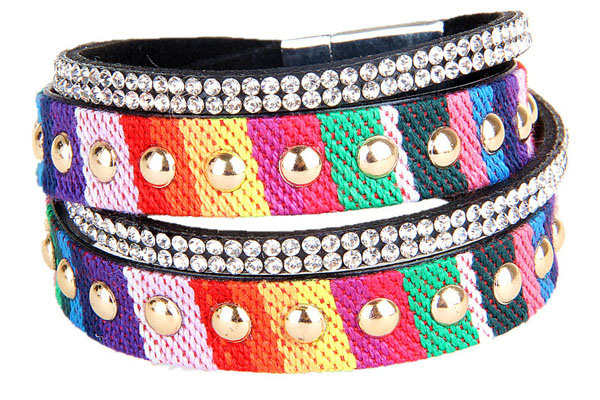 Colorful Braid Crystal & Golden Rivet PU Leather Bracelet
