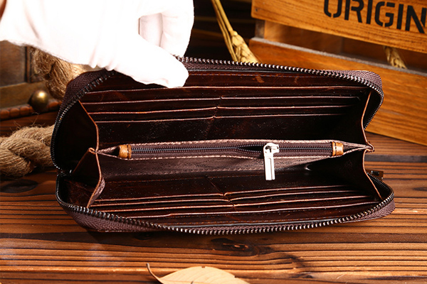 The interior lining with 12 card slots and two bill slot, ID windows and a zip pocket.