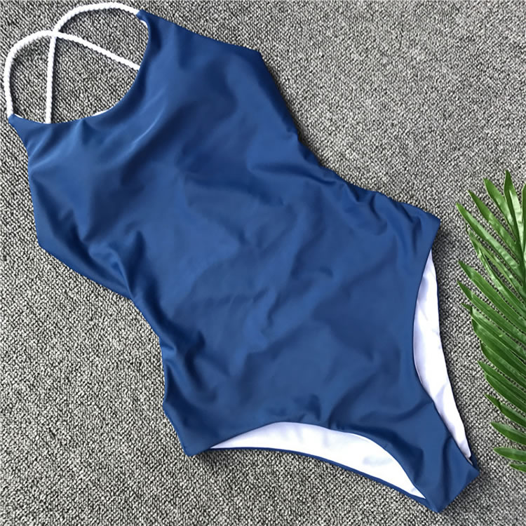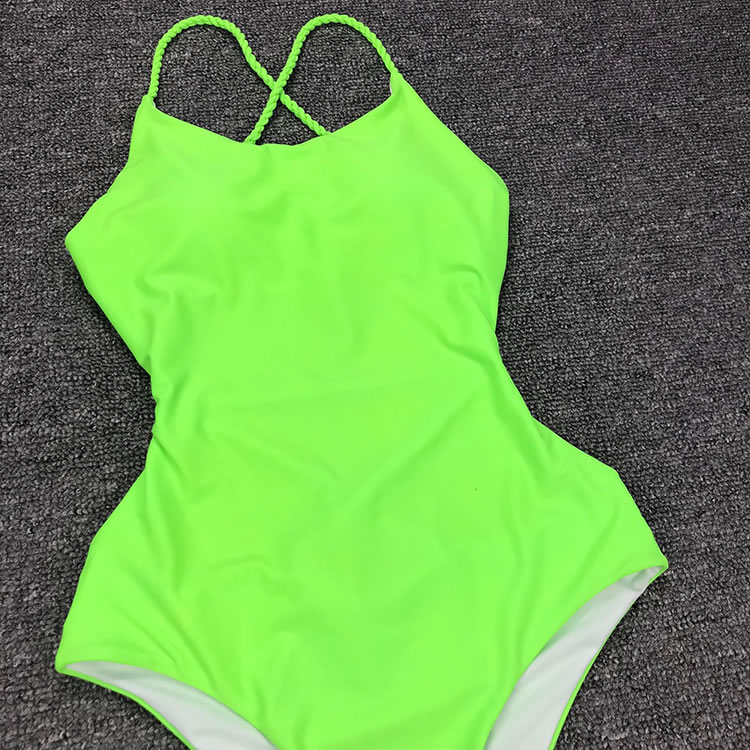 Sexy one piece swimsuit featuring open back with criss cross braided strappy detail, allover solid color and high cut leg design.