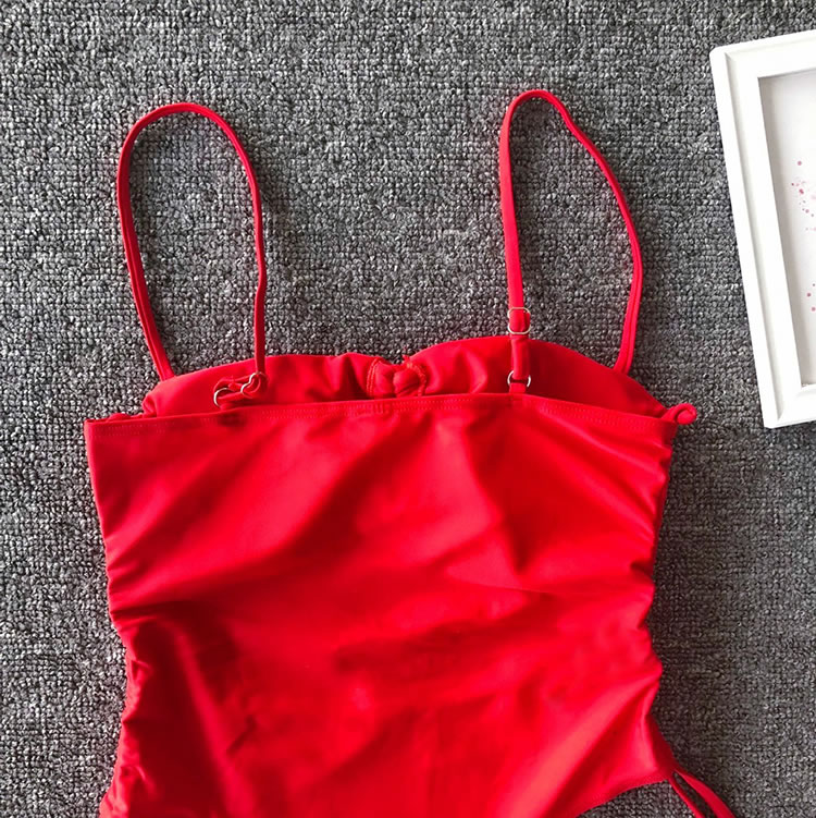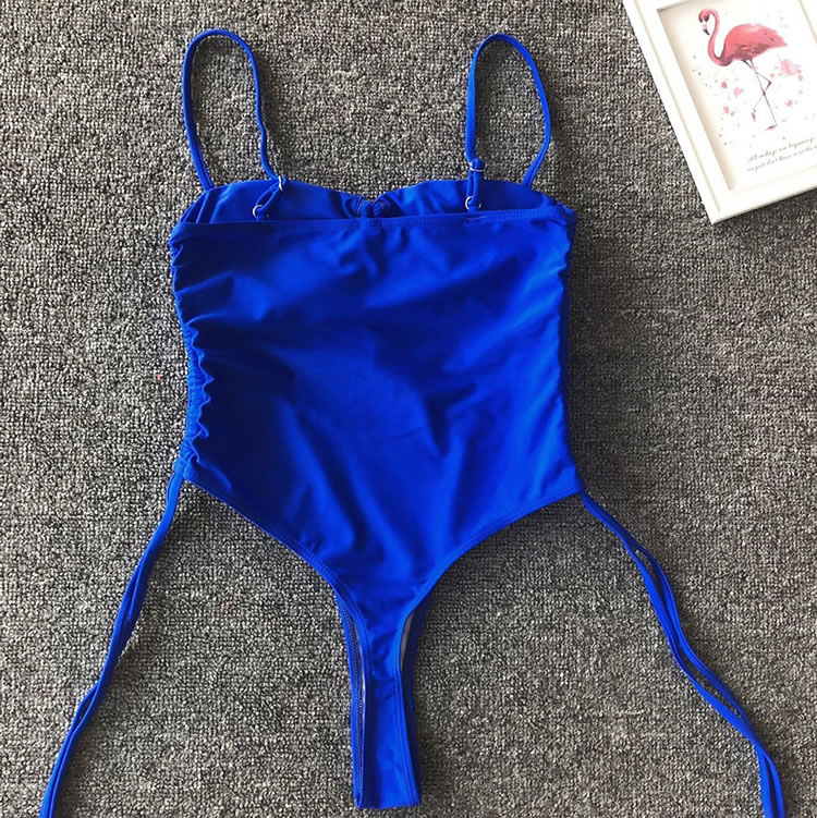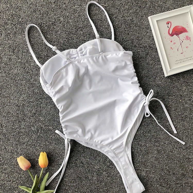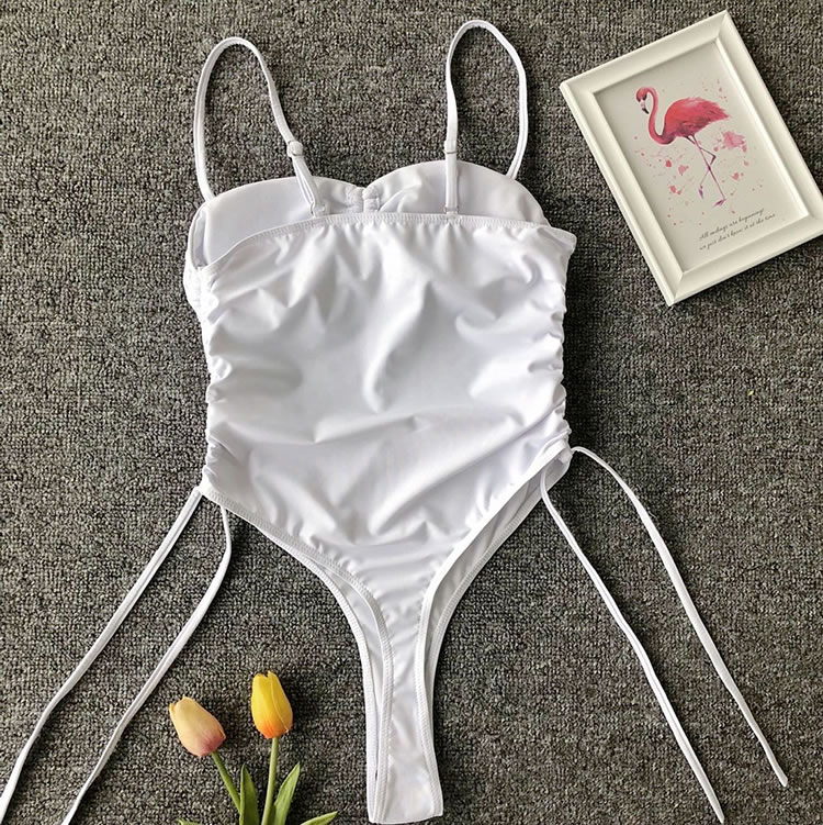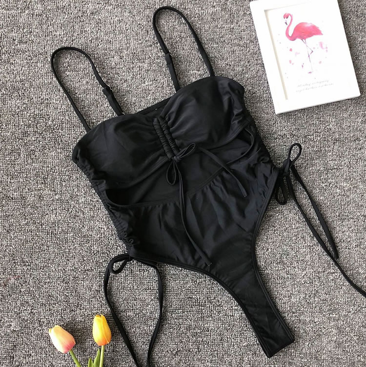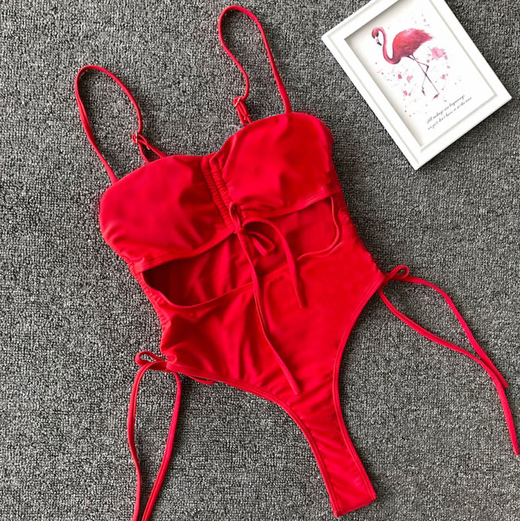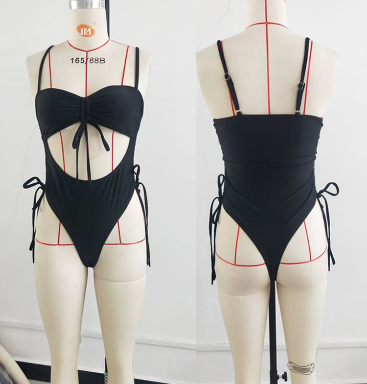 Turn heads at the pool in this exclusive one piece swimsuit featuring a square neckline, adjustable spaghetti straps, a keyhole front opening, lace-up sides, and a thong cut back.