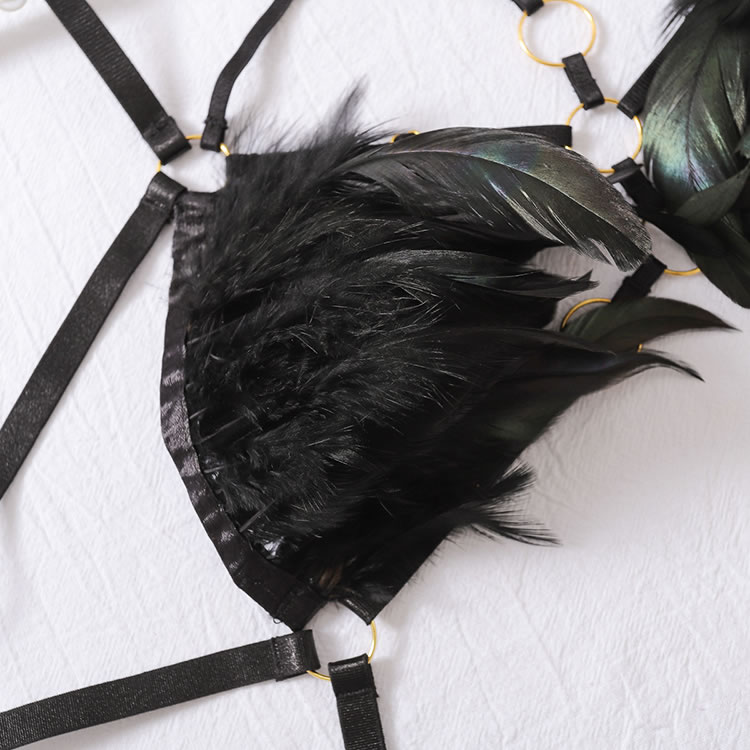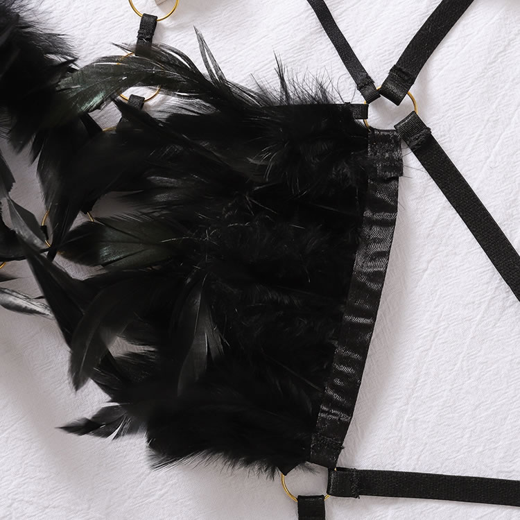 Daring Black Feathered Lingerie Set with Strappy Design