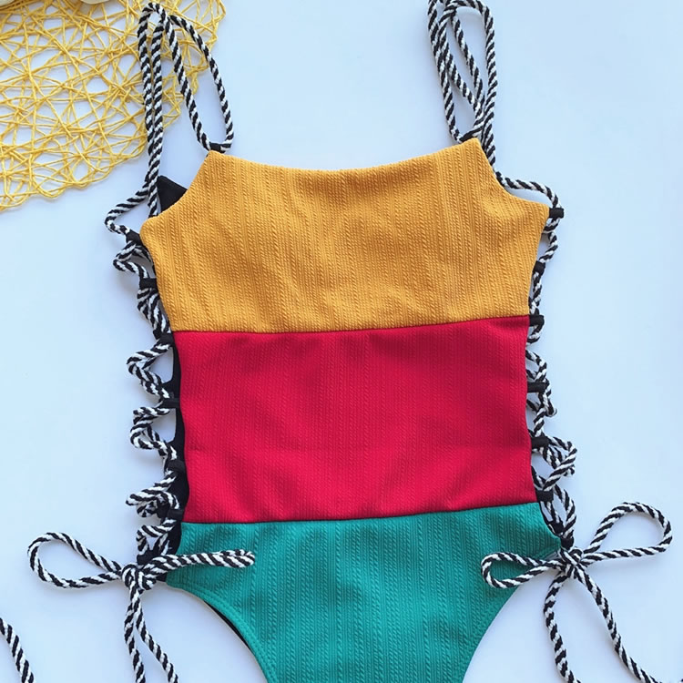 Bask beneath the sun in this exclusive one piece swimsuit featuring a squared neckline, open side panels with lace-up detailing, high cut sides, and a cheeky cut back.