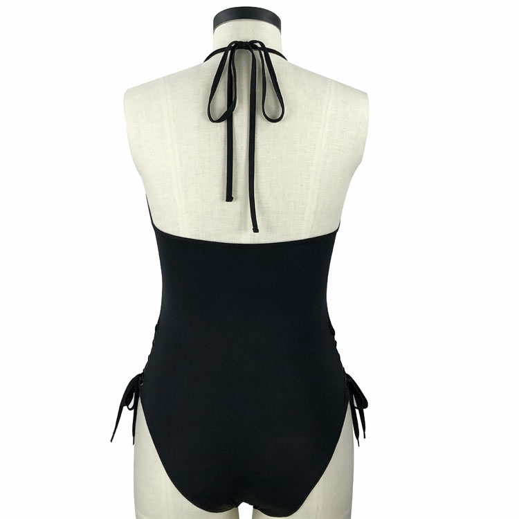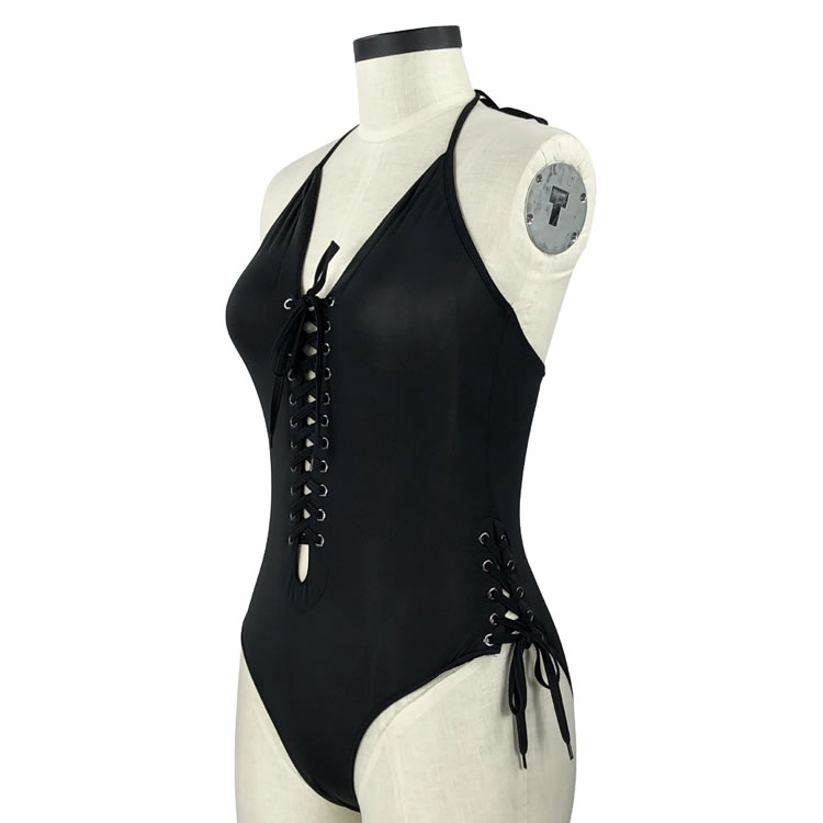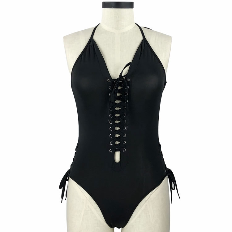 Show off all your irresistible curves in this stunning monokini featuring a plunging V-neckline, a lace-up bodice, adjustable lace-up side panels, high cut sides, halter ties, and a cheeky cut back.