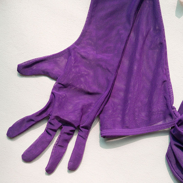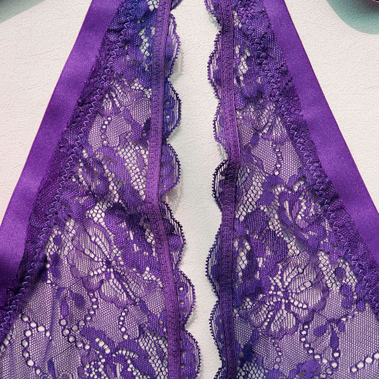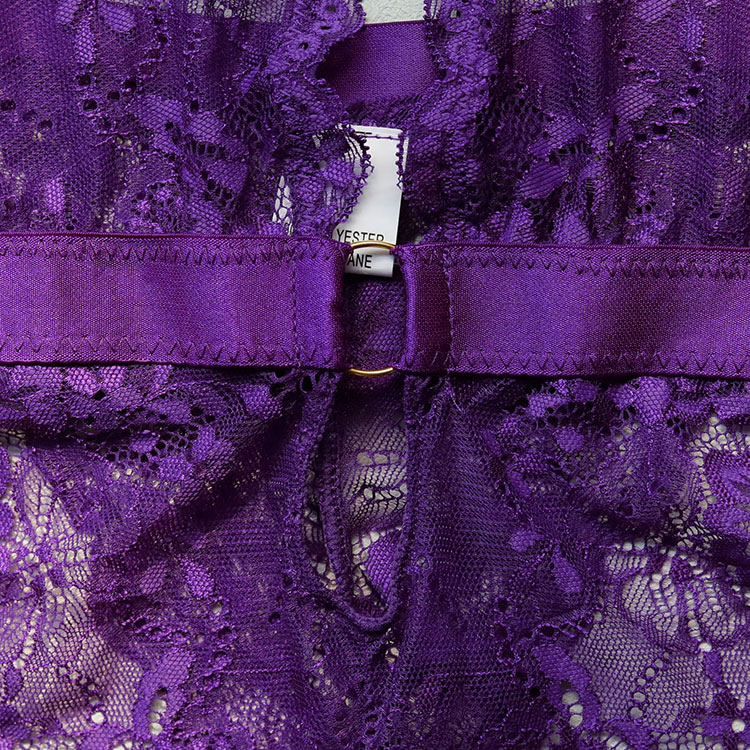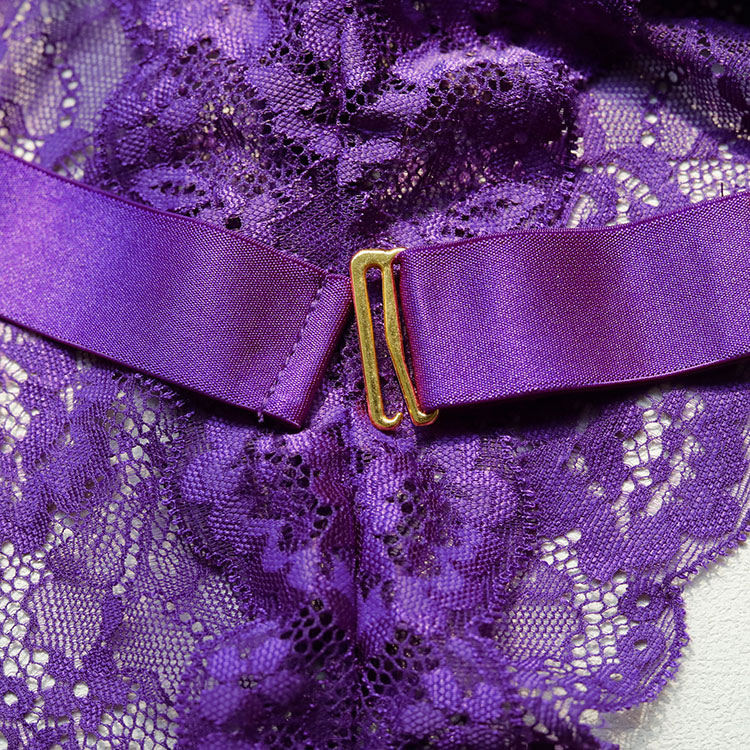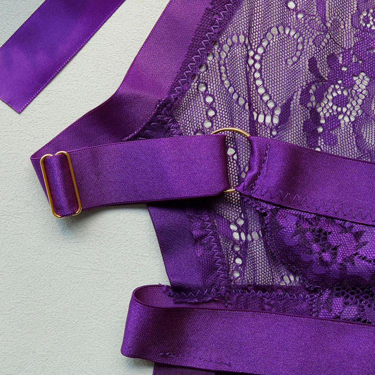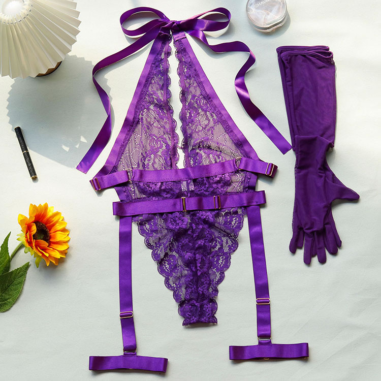 Make a statement with this bold purple lace bodysuit that exudes confidence and allure. The intricate lace detailing and deep V-neckline create a captivating silhouette, while the matching garters add a touch of vintage charm. Perfect for those who love to embrace their sensuality, this bodysuit pairs beautifully with gloves for an extra layer of sophistication.