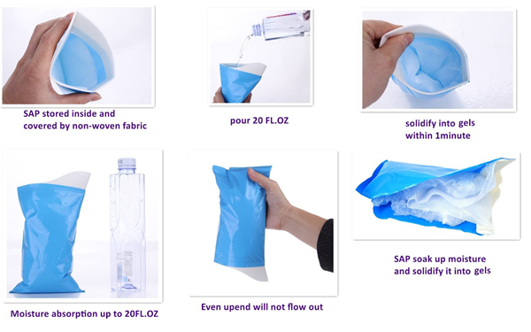 Convenient, unisex urinals containing super absorbent material(SAP), hygienic, odorless, nontoxic.