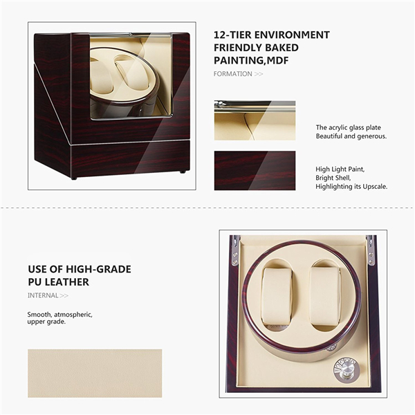 100% handmade and good value. The use of acrylic glass, environmental protection piano lacquer and transmission using copper fittings. Two turntables with PU soft watch pilow, smooth, atmosphere and quality with high-grade.
